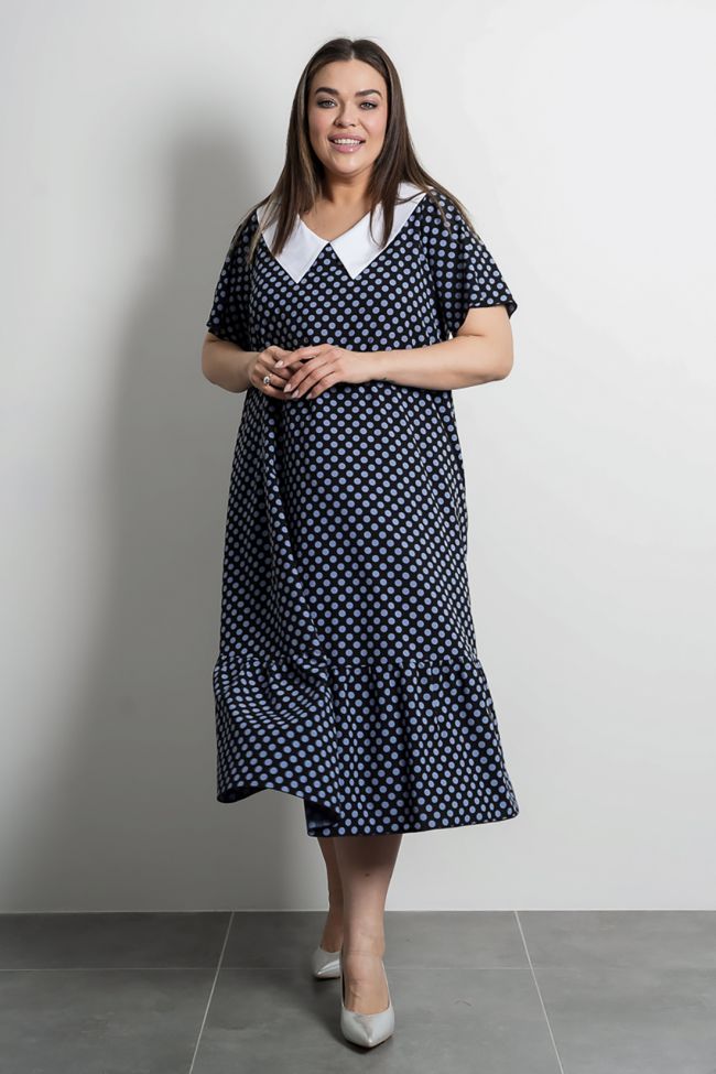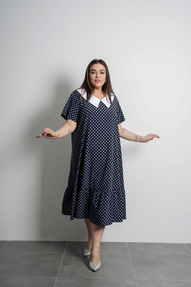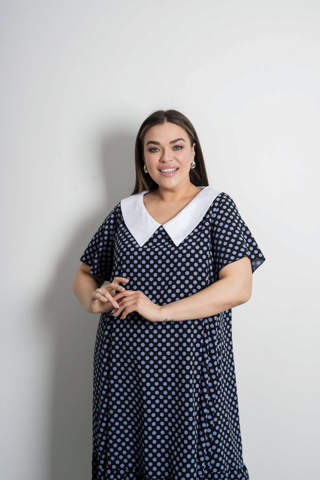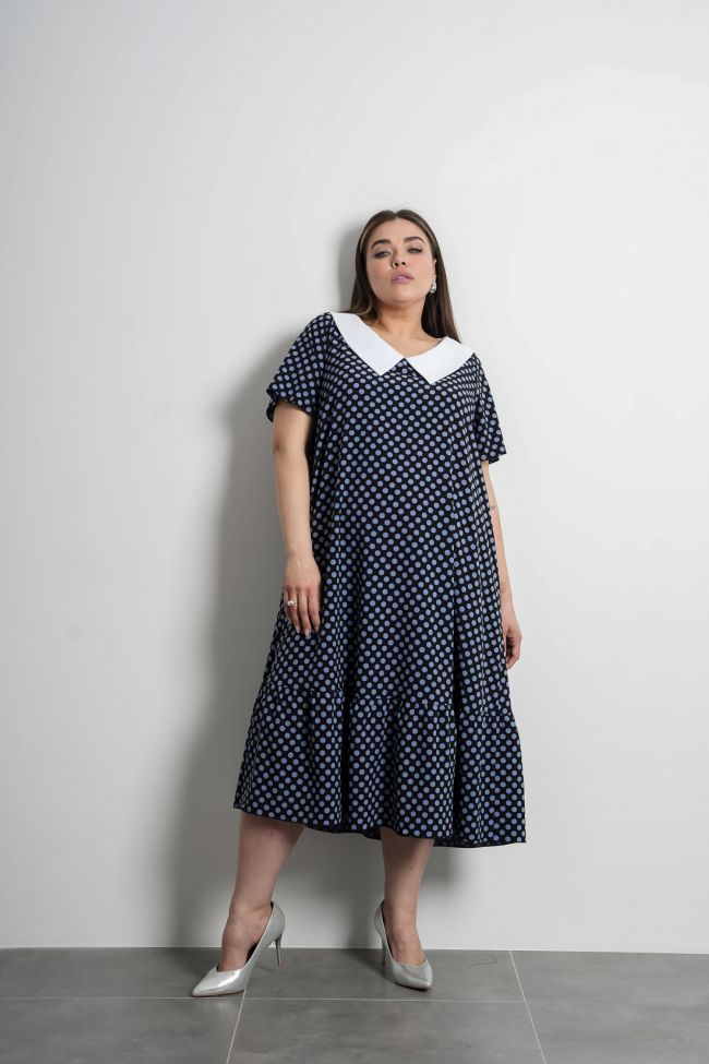 синий Длинное платье расклешенного силуэта из легкой плательной ткани. Вырез горловины оформлен отложным воротником из отделочной ткани. Рукава втачные короткие. В боковых швах удобные карманы. Низ дополнен горизонтальным подрезом с широкой оборкой. Модель прекрасно подчеркнет Вашу женственность и романтичность. Прекрасный выбор для летней погоды.