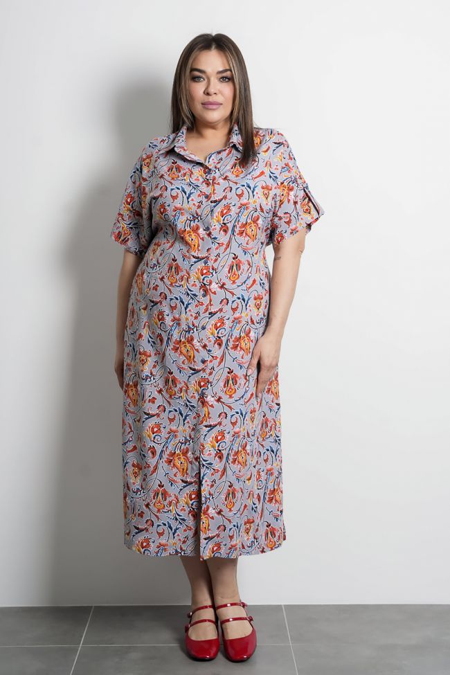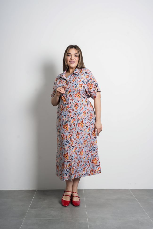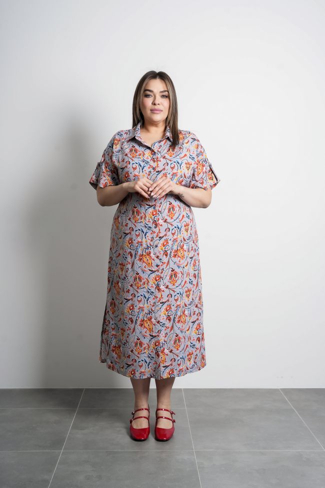 серый Платье-рубашка прямого силуэта из хлопковой ткани. По центру переда  застежка на петли-пуговицы. Горловина оформлена воротником рубашечного типа. Без рукава, спущеная линия плеча дополнена манжетой.  По переду, в области бедер карманы в швах. Спинка со средним швом, прямая.  По низу боковых швов разрезы. Платье-рубшка  прекрасно дополнит повседневный летний гардероб.