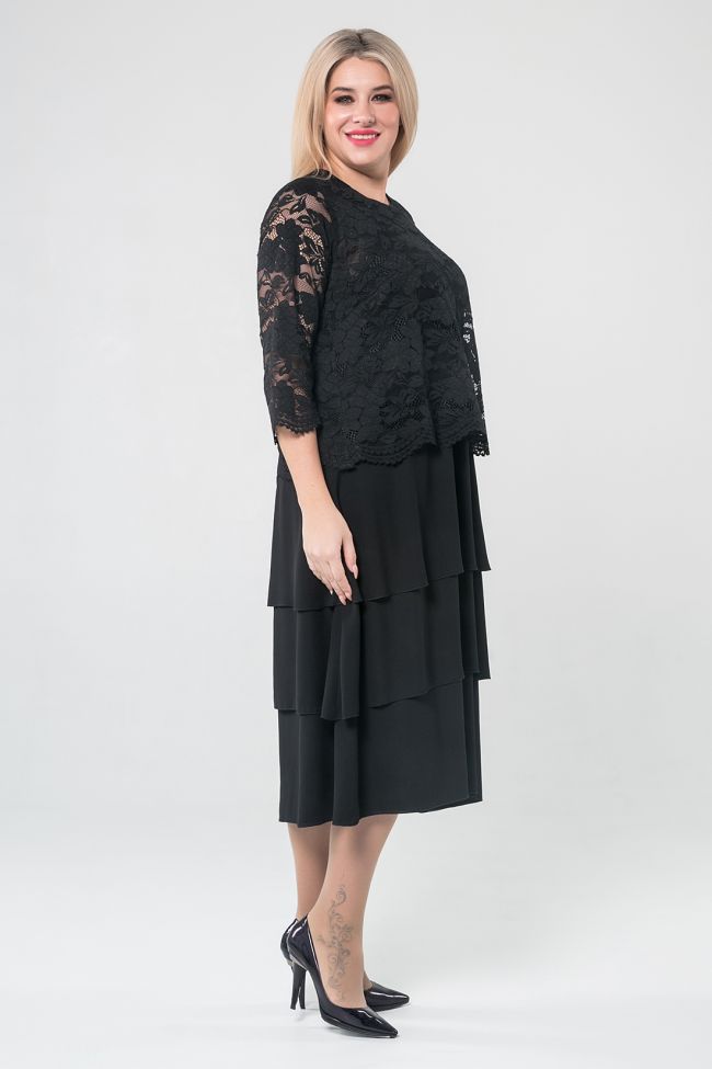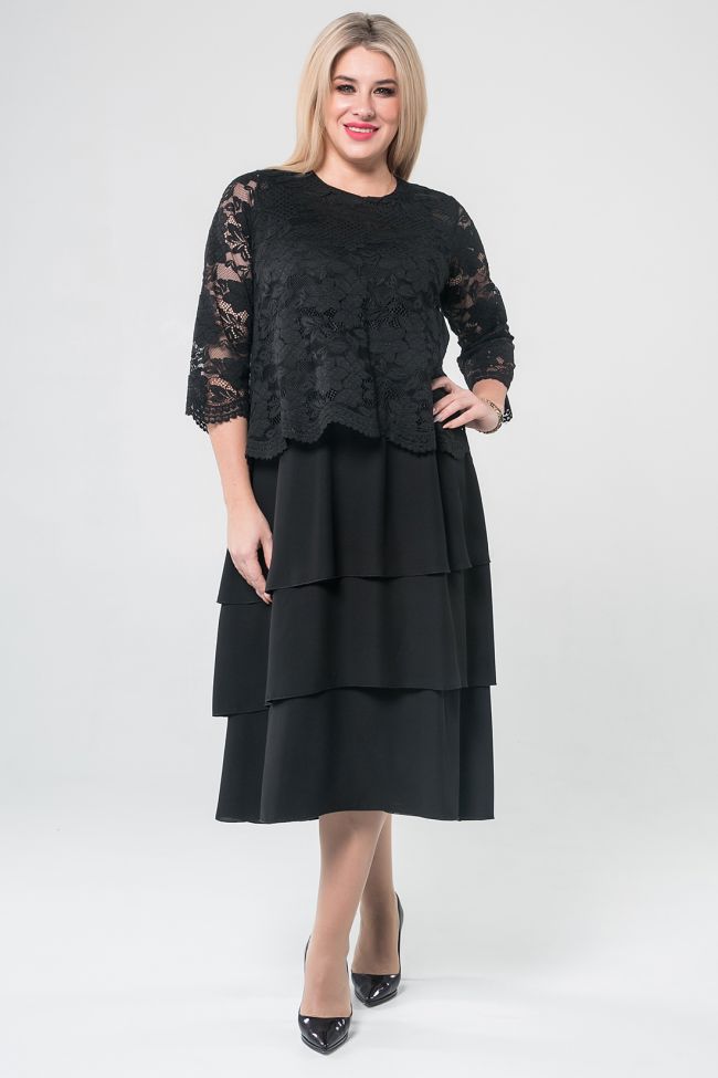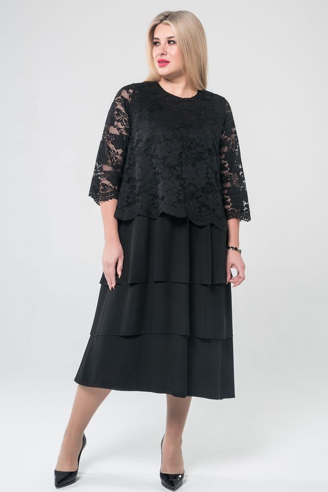черный Оригинальное многослойное платье А-силуэта из двух видов  тканей. Перед и спинка из кружевного полотна на подкладе "стрейч". Круглый вырез горловины обработан изнутри. Втачные кружевные рукава длиной 3/4 . Юбка спинки и переда  выполнена из шифона в три асимметричных слоя. Низ ровный. Крой платья отлично подойдет дамам с любым типом фигуры. Платье отлично будет смотреться в торжественной обстановке.