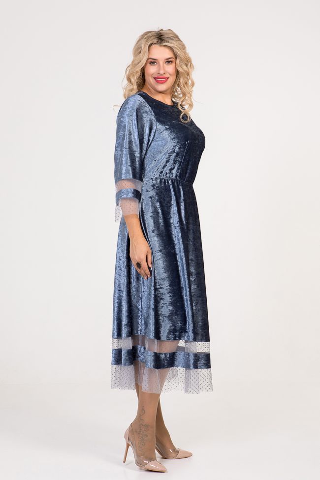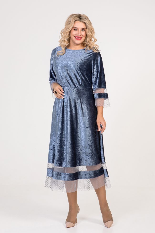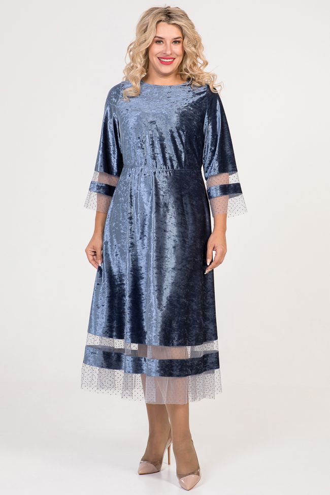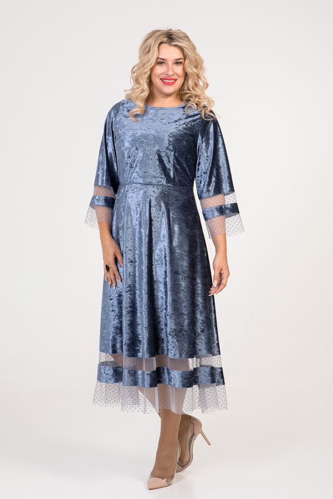 серый Интересное бархатное платье приталенного силуэта. Прилегание по талии - за счет эластичной тесьмы. Круглый вырез горловины обработан на спецмашине. Втачные рукава длиной 7/8 и  расклешенный низ изделия - дополнены оригинальными двойными вставками из трикотажной сетки.