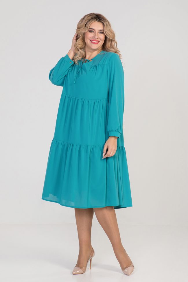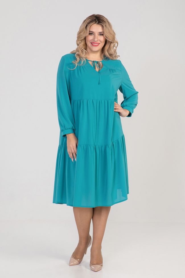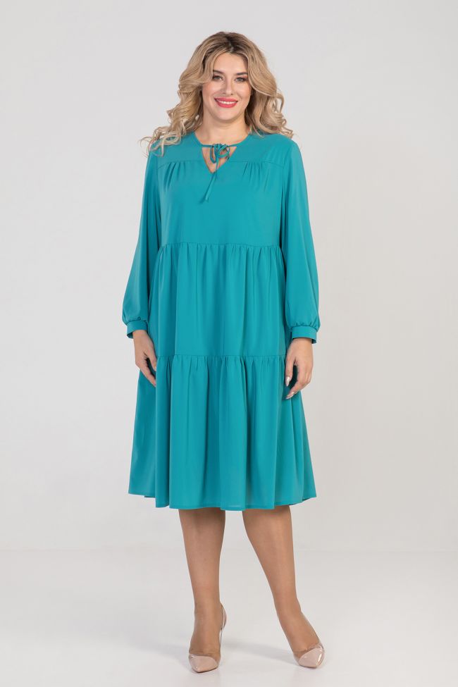 бирюзовый Комфортное платье свободного силуэта из креп-шифона на подкладе. По переду кокетка со сборкой по груди. Рукав втачной длинный, по низу присборен и дополнен манжетой с застежкой на петлю и пуговицу. V - образный вырез горловины обработан окантовкой переходящей в завязки. Отрезная линия под грудью и в области бедра дополнена мелкой сборкой. Низ расклешен, ровный без разрезов.
