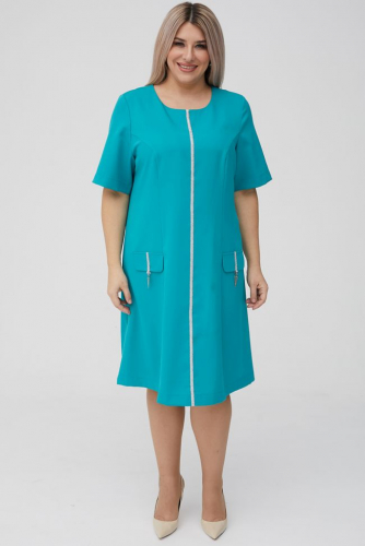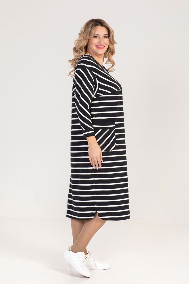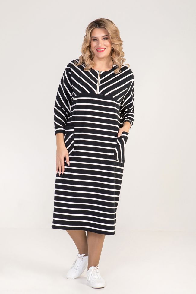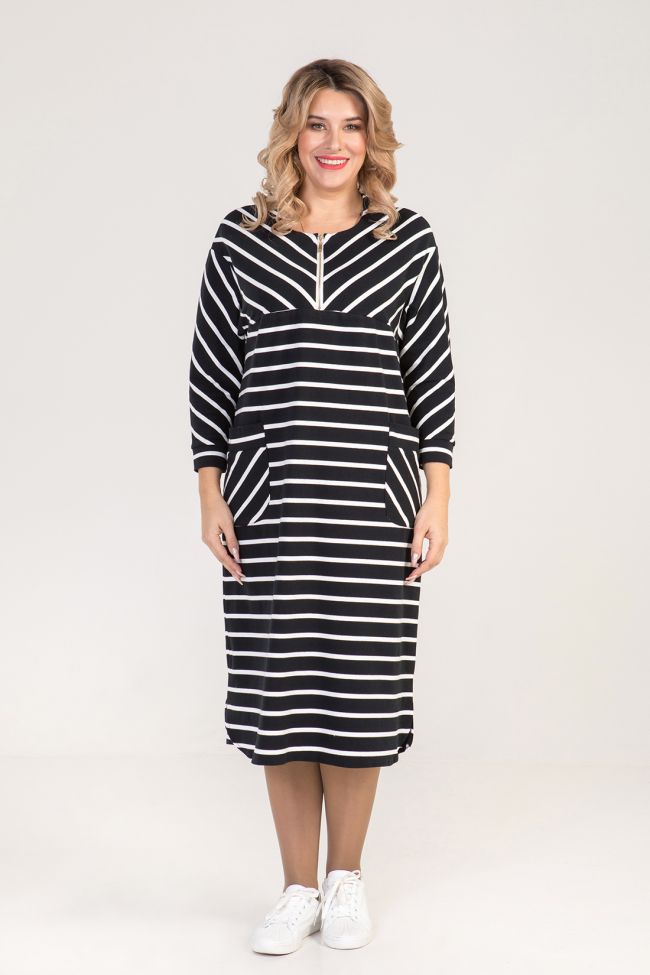 черный Платье прямого силуэта из трикотажного полотна с комбинированной полоской.  Перед и спинка отрезные по линии груди. Круглый вырез горловины обработан внутренней обтачкой. По центру переда застежка на тесьму - молнию. Линия плеча приспущенная, рукава длиной за локоть, по низу оформлены манжетами. По переду  удобные накладные карманы. Спинка со швом по центру. Низ фигурный, с разрезами и закруглением по боковым швам.