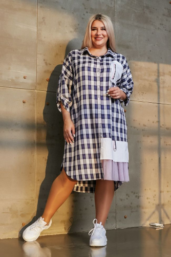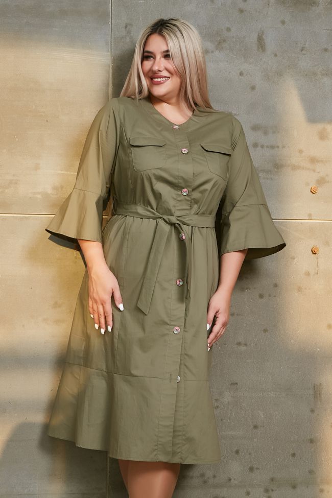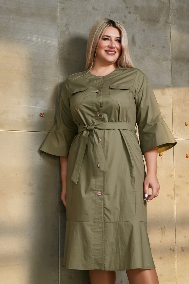 хаки Изящное платье прилегающего силуэта из хлопковой ткани, длиной за линию колен. Комфортное прилегание по фигуре - за счет вертикальных рельефов переда и спинки. Вырез горловины круглый, по борту притачная планка с застежкой на петли и пуговицы. В боковых швах удобные карманы, на уровне груди накладные карманы с клапаном. Втачные рукава длиной ¾. Перед, спинка и рукава по низу дополнены воланом. Низ ровный. Модель комплектуется поясом.