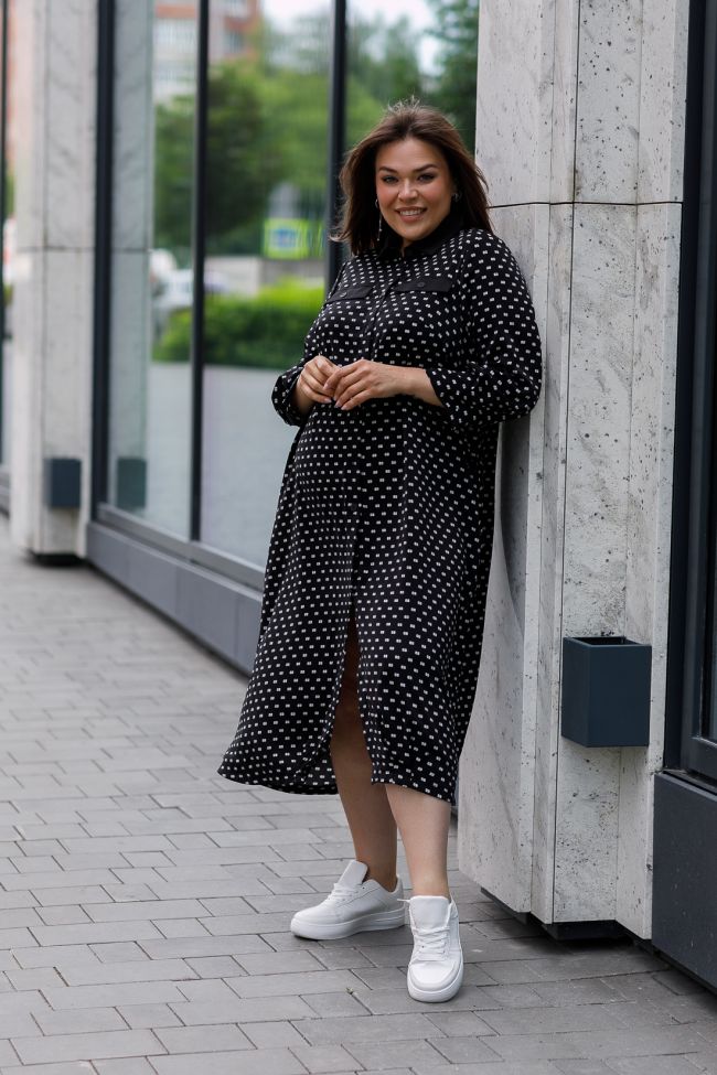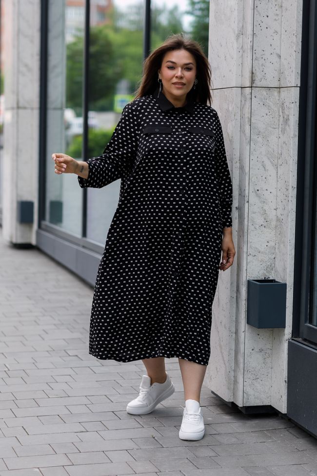 черный Платье прямого силуэта из плательной ткани в принт. Прилегание по груди за счет вытачек. По линии груди декоративные элементы в виде клапанов с пуговицей. Горловина оформлена отложным воротником на притачной стойке. По переду планка по всей длине изделия, с застежкой на петли и пуговицы. Втачной рукав длиной 7/8 по низу оформлен двумя складками. В боковых швах удобные карманы. Низ прямой. Стильный, удобный вариант для летних прогулок.