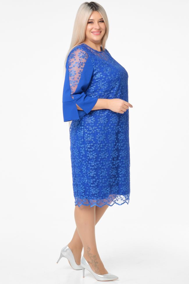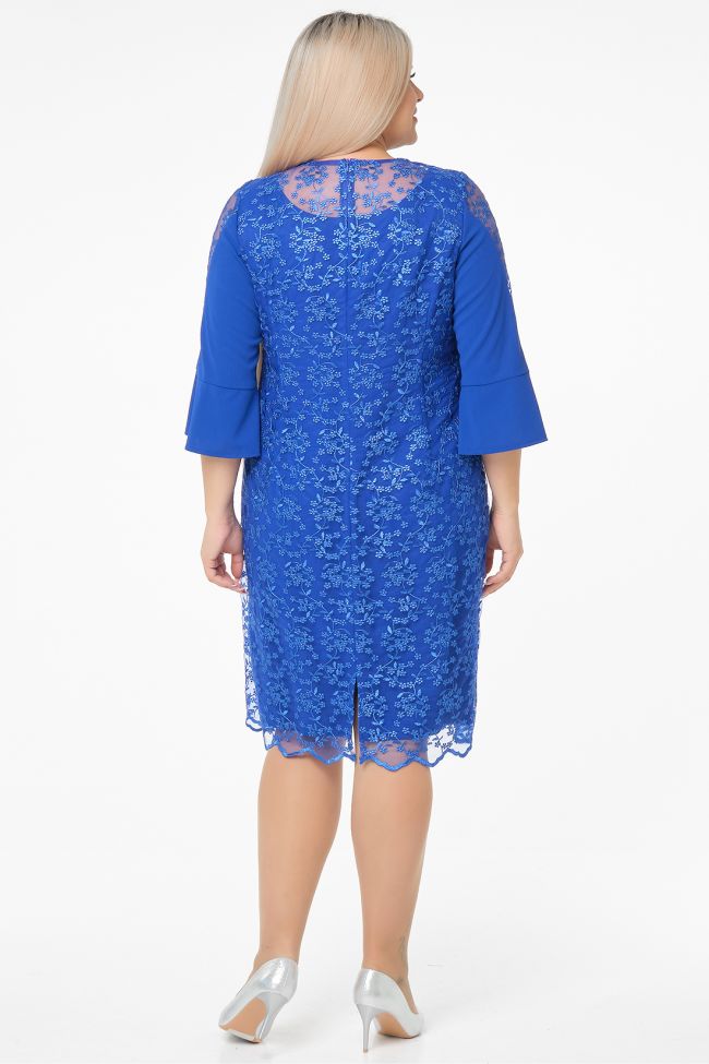 синий Нарядное двойное платье полуприлегающего силуэта. Верх из кружевного полотна, нижний слой - плательный трикотаж "Скуба". Прилегание по груди за счет вытачек. Спинка со швом по центру, с застежкой на тесьму молнию и разрезом снизу. Горловина кружевного верха округлой формы, обработана узким швом, нижний слой имитирует кокетку по переду и спинке. Рукава втачные длиной 3/4, с центральной кружевной вставкой, по низу дополнены воланом.  Кружевной слой по низу с фестонами, нижний слой - ровный.