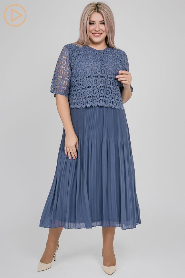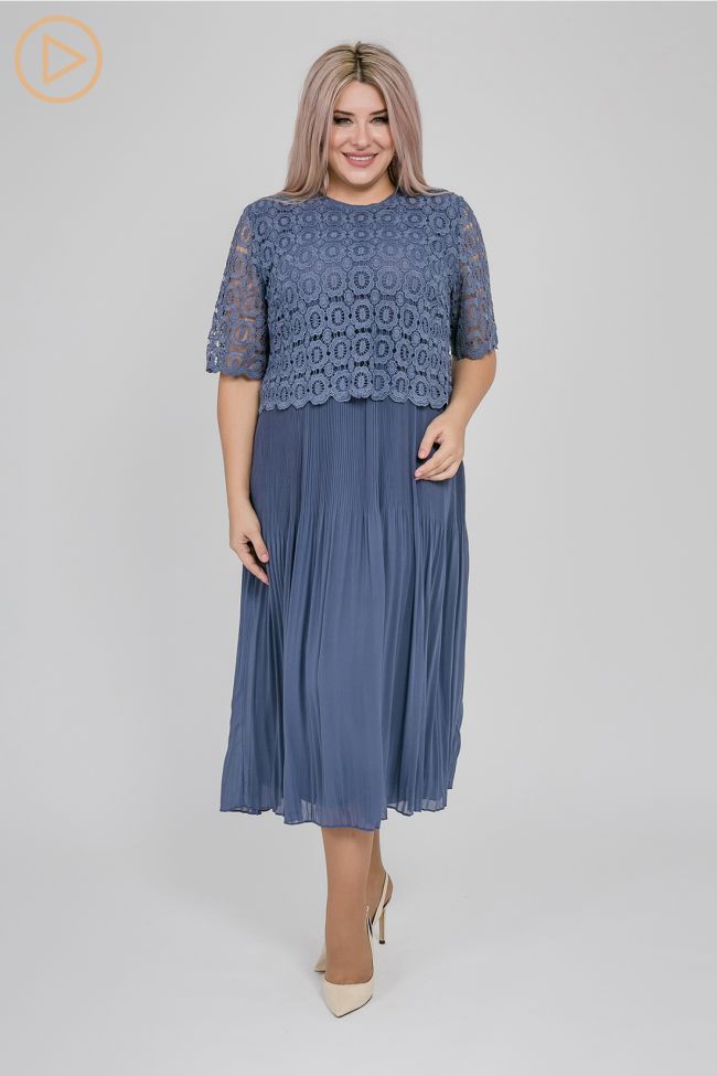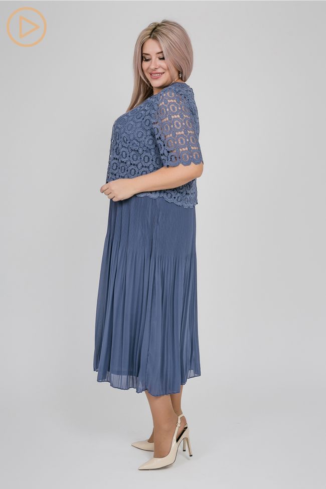 голубой Нарядное длинное платье. Перед и спинка с отрезной линией талии. Лиф двойной - верхний слой переда и спинки отлетной длиной до линии талии, выполнен из кружева. Втачные кружевные рукава укороченной длины. Лиф и рукава по нижнему срезу оформлены фестонами. Нижний слой лифа - трикотаж в тон с притачной юбкой из плиссе на подкладке. Слои соединены между собой по горловине. В среднем шве спинки застежка на петлю и пуговицу. Отличный вариант для торжественных случаев.