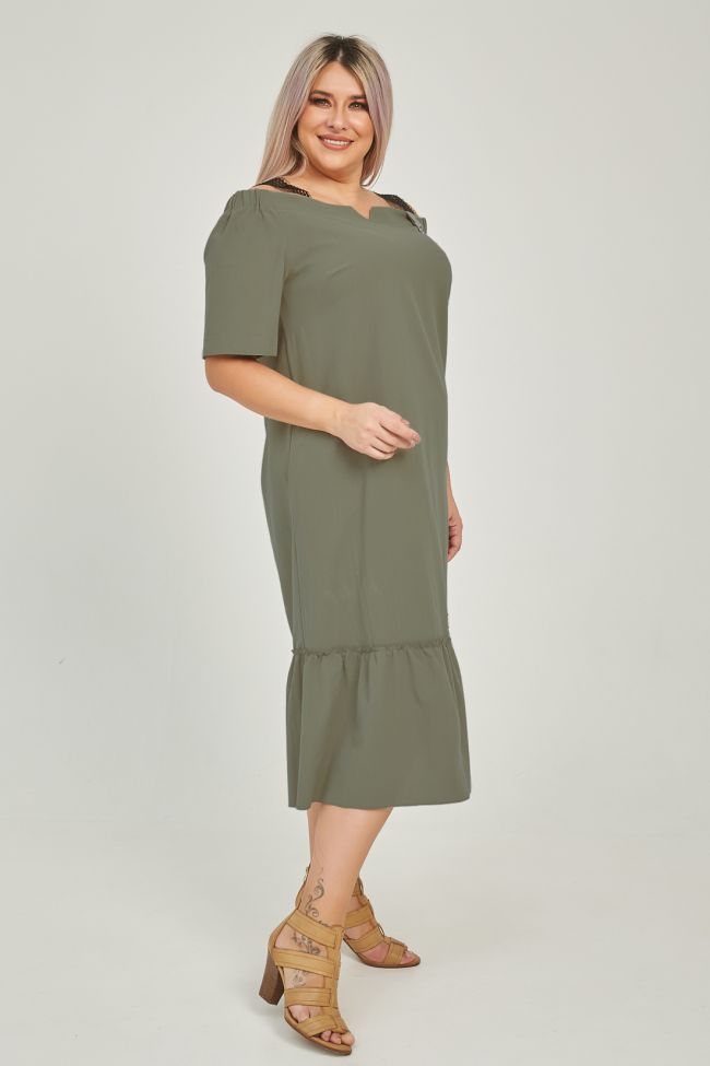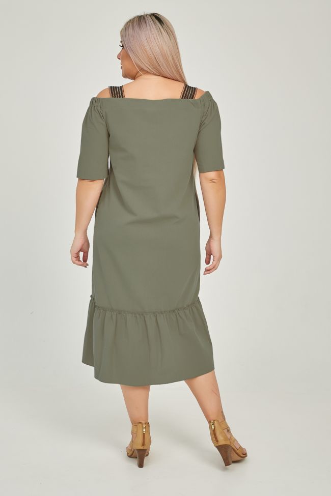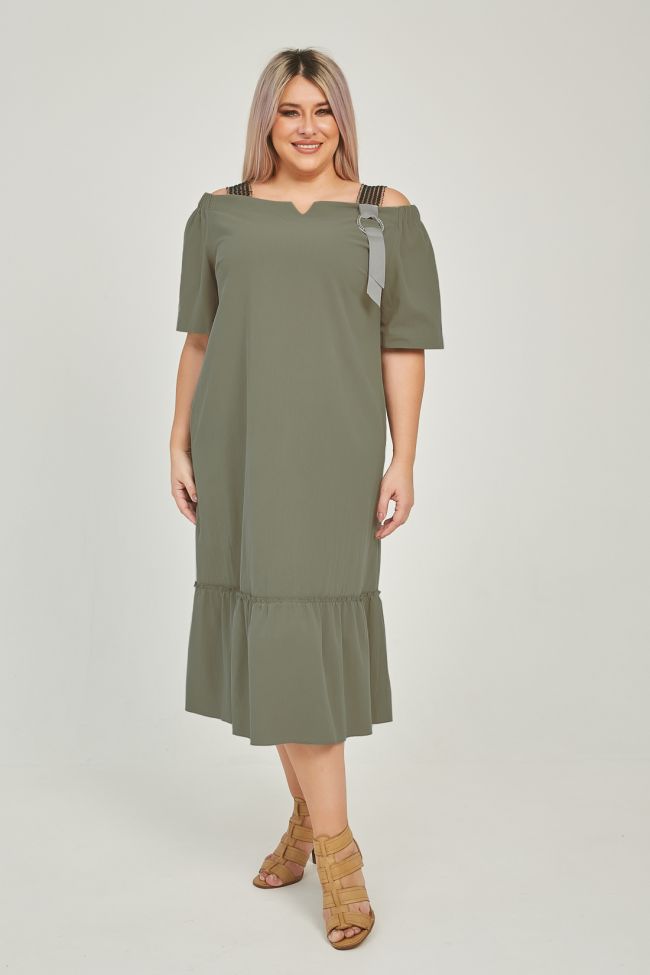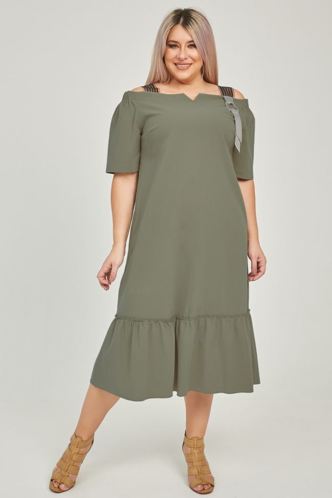 зеленый Длинное платье А - образного силуэта из хлопкового полотна. Прилегание по груди за счет вытачек. В боковых швах удобные карманы. Верх изделия с открытой линией плеча, дополнен широкими бретелями из эластичной тесьмы. По переду вырез фигурный, по плечам прилегание за счет широкой резины. Рукава укороченные. Низ изделия ровный дополнен широкой оборкой. В области груди слева расположен декор в виде кольца с тесьмой.