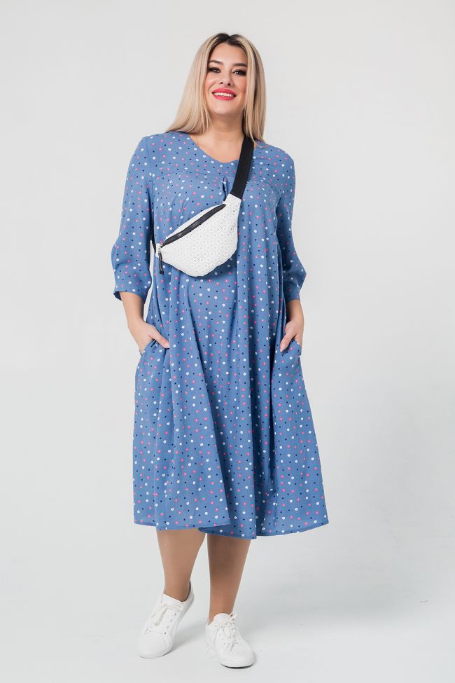 синий Женственное летнее  платье свободного силуэта. Модель выполнена из штапельной ткани в нежный принт. По переду горизонтальная кокетка, центр переда дополнен встречной складкой. Прилегание по груди за счет вытачек. V-образный вырез горловины обработан внутренней обтачкой. Втачные рукава длиной 3/4, по центру низа со встречной складкой. В боковых швах удобные карманы. Низ ровный. Легкое платье обеспечит свободу движений и поможет создать легкий романтичный образ.