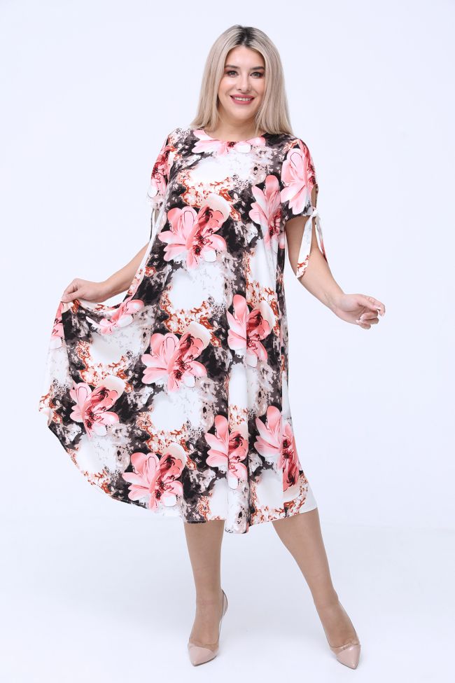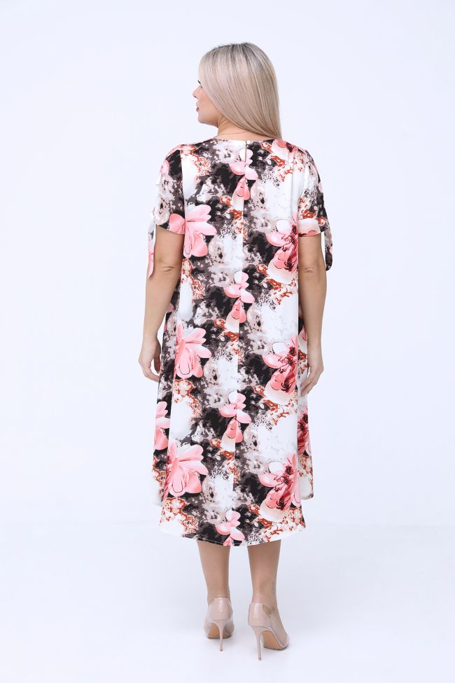 розовый Комфортное платье А-образного силуэта из плательной ткани в яркий принт. Круглый вырез горловины обработан внутренней обтачкой. Спинка со средним швом, вверху оканчивающимся разрезом с застежкой на петлю и пуговицу. В боковых швах удобные карманы. Втачные укороченные рукава с круглым вырезом, по низу дополнены завязками. Женственное, легкое платье станет прекрасным дополнением вашего летнего гардероба.