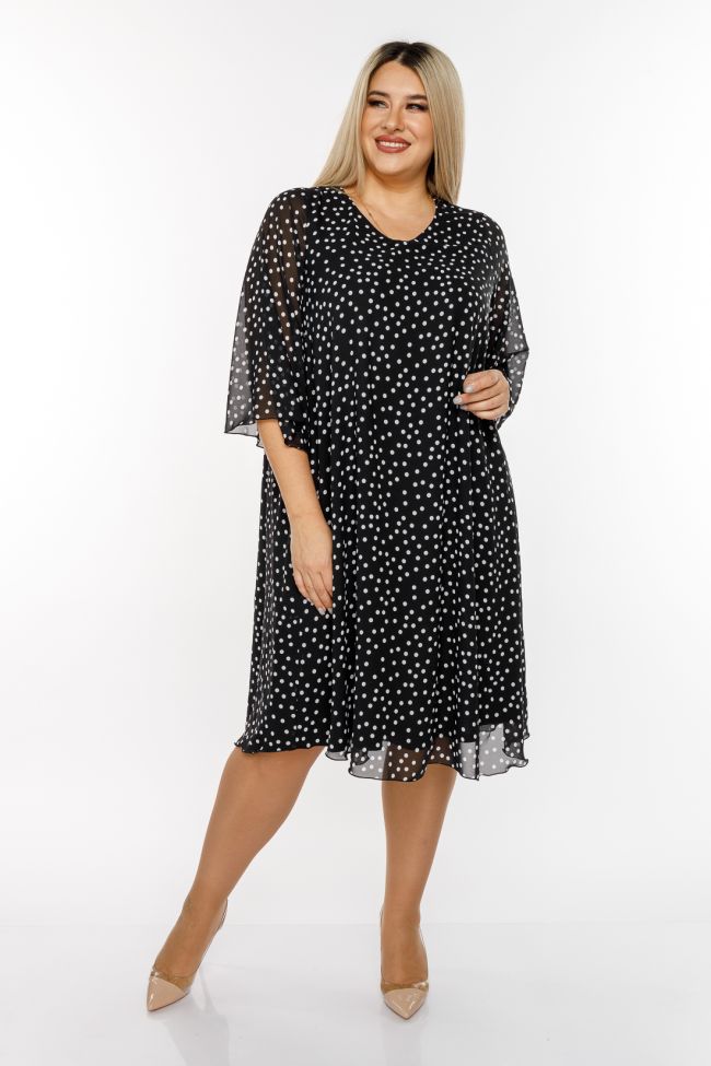 черный Женственное платье A-образного силуэта из шифона с вытравным рисунком, на трикотажной подкладке. V-образный вырез горловины позволяет украсить зону декольте любым украшением.  Рукава втачные расклешенные,  длиной 7/8. Легкое платье обеспечит свободу движений и поможет создать легкий романтичный  образ.