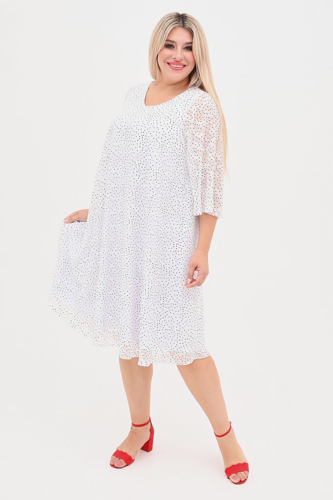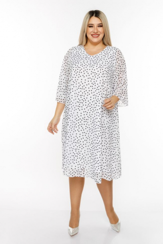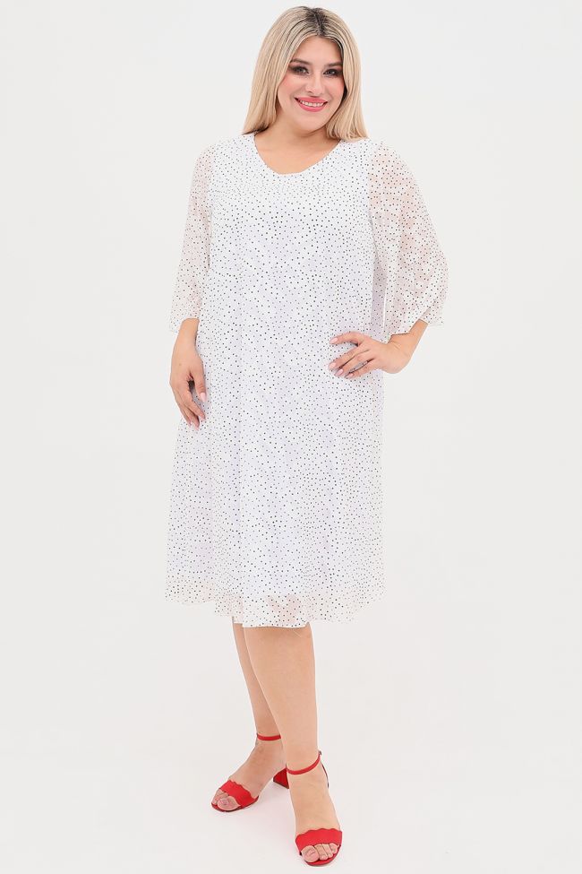 белый Женственное платье A-образного силуэта из шифона с вытравным рисунком, на трикотажной подкладке. V-образный вырез горловины позволяет украсить зону декольте любым украшением.  Рукава втачные расклешенные,  длиной 7/8. Легкое платье обеспечит свободу движений и поможет создать легкий романтичный  образ.