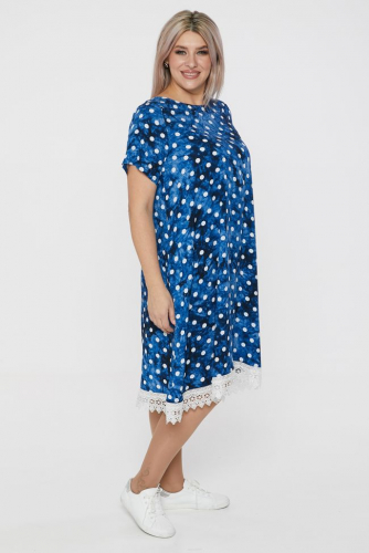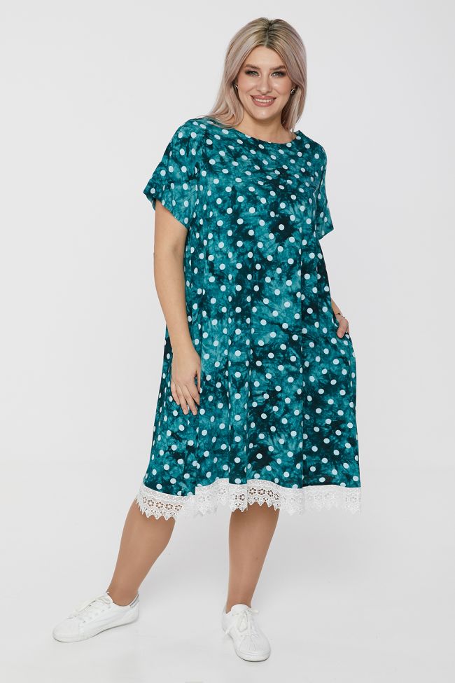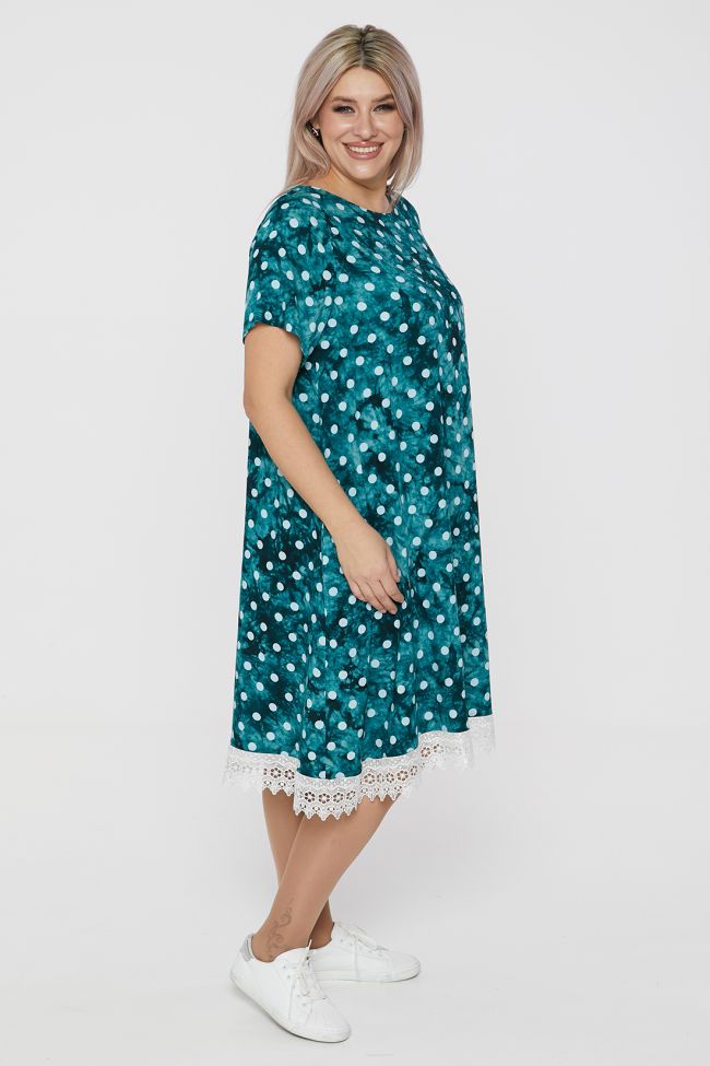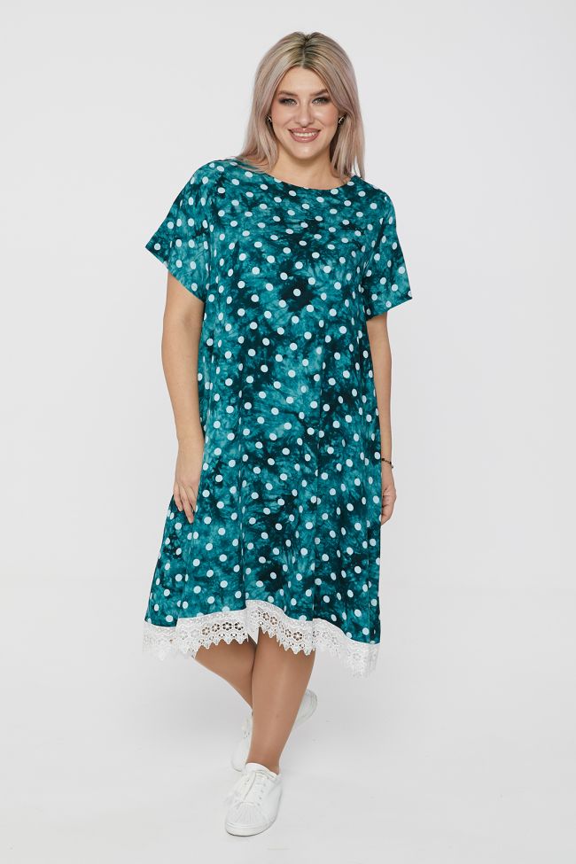 светло-зеленый Платье трапециевидного силуэта, длиной за колено. Выполнено из дышащей хлопковой ткани с ярким принтом. Модель имеет простой круглый вырез горловины и короткие втачные рукава. Низ асимметричный, декорирован кружевом. Замечательный выбор для комфортных прогулок.