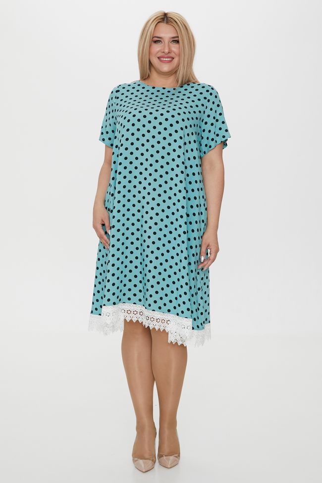 бирюзовый Платье трапециевидного силуэта, длиной за колено. Выполнено из дышащей хлопковой ткани с ярким принтом. Модель имеет простой круглый вырез горловины и короткие втачные рукава. Низ асимметричный, декорирован кружевом. Замечательный выбор для комфортных прогулок.