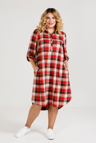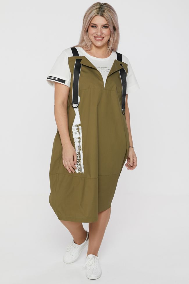 зеленый Эффектное платье с имитацией двойки, О - образного силуэта, выполнено из хлопкового полотна. Перед и спинка с горизонтальными подрезами в нижней части. Спинка однотонная. По переду горизонтальный подрез по груди, лиф двойной, верхний слой оформлен двумя лацканами и декоративными широкими лямками. Нижний слой имитирует футболку с круглым вырезом горловины. В боковых швах удобные карманы. Рукава укороченные, на правом рукаве декор в виде тесьмы. В качестве отделки справа по переду оригинальный печатный рисунок. Низ ровный. Стильная и практичная модель станет отличным дополнением Вашего гардероба.