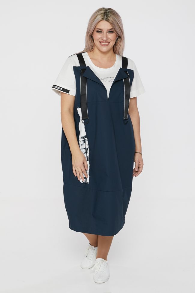 темно-синий Эффектное платье с имитацией двойки, О - образного силуэта, выполнено из хлопкового полотна. Перед и спинка с горизонтальными подрезами в нижней части. Спинка однотонная. По переду горизонтальный подрез по груди, лиф двойной, верхний слой оформлен двумя лацканами и декоративными широкими лямками. Нижний слой имитирует футболку с круглым вырезом горловины. В боковых швах удобные карманы. Рукава укороченные, на правом рукаве декор в виде тесьмы. В качестве отделки справа по переду оригинальный печатный рисунок. Низ ровный. Стильная и практичная модель станет отличным дополнением Вашего гардероба.