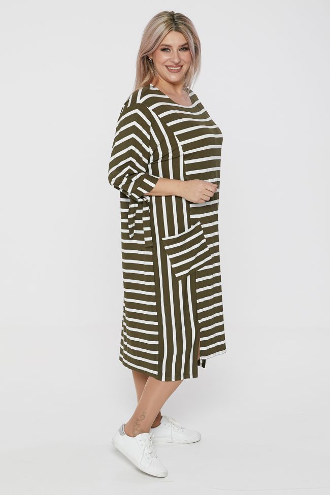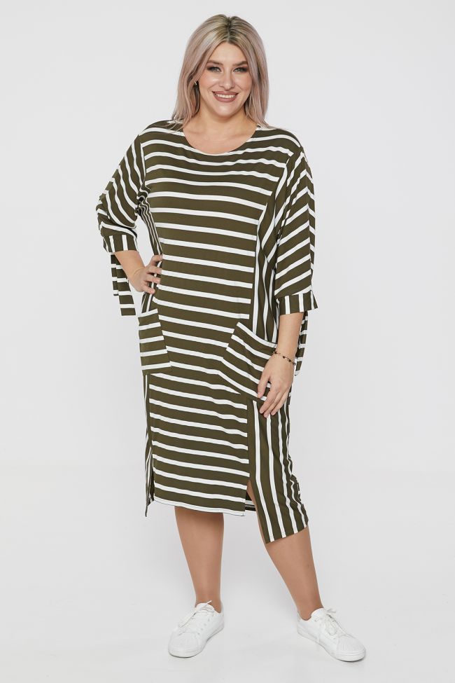 зеленый Платье прямого силуэта из трикотажного полотна. Круглый вырез горловины обработан на спецмашине. По переду вертикальные рельефы и удобные накладные карманы. Спинка цельнокроеная.  Линия плеча приспущенная, рукава длиной за локоть, по низу оформлены манжетами переходящими в завязки. Низ разноуровневый, обработан на спецмашине.