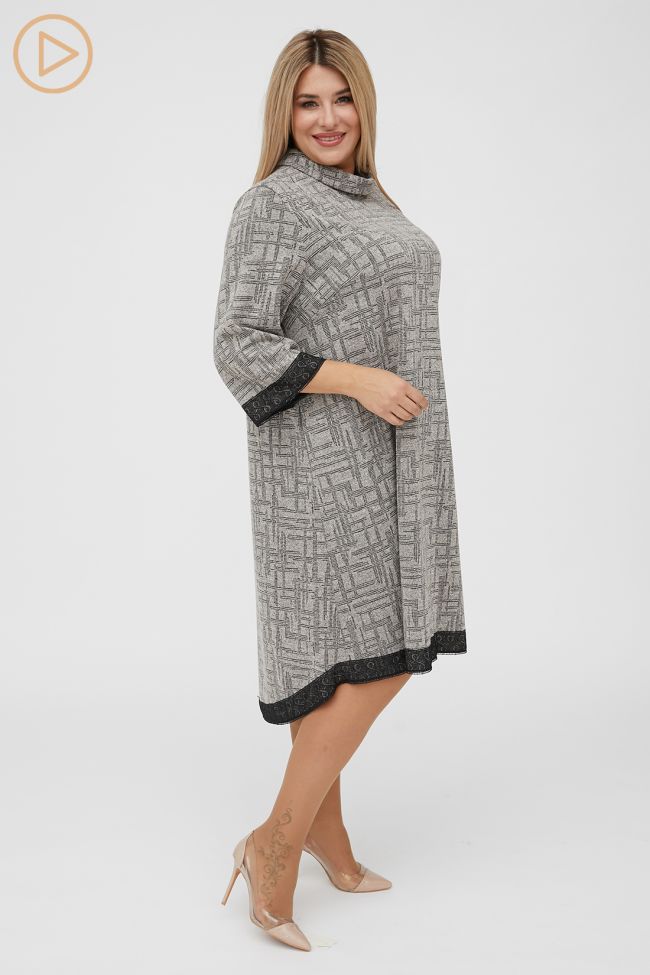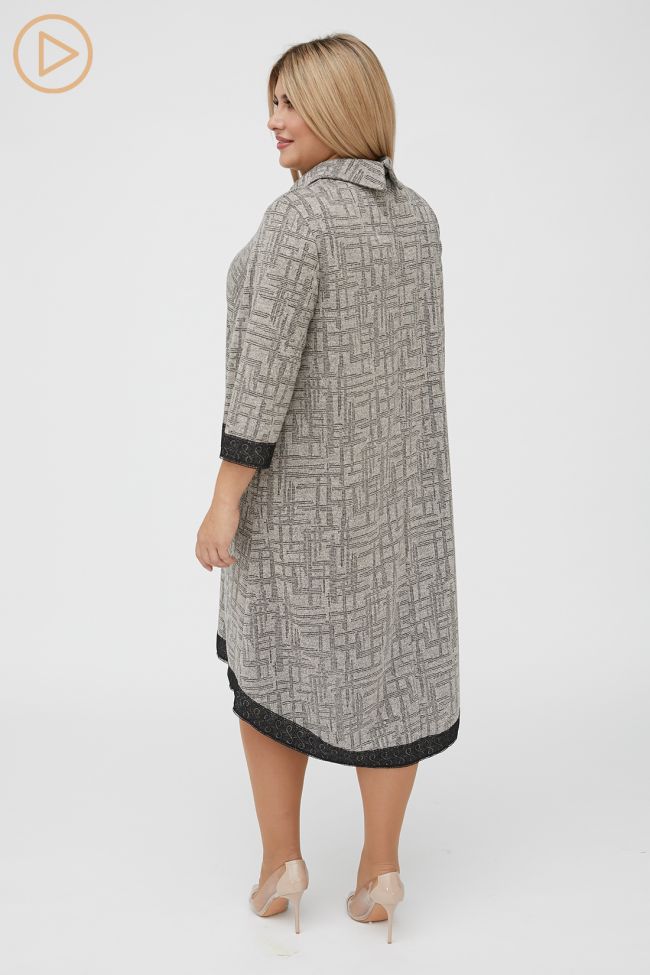бежевый Платье А - образного силуэта длиной за колено, выполнено из трикотажа жаккард. Прилегание по груди за счет вытачек. Круглый вырез горловины оформлен воротником-хомут. По спинке средний шов, оканчивающийся застежкой на тесьму- молнию и пуговицу. Втачные рукава, комфортной длины 3/4. Низ изделия асимметричный. В качестве декора по низу изделия и рукавам отделка в виде кружева. В боковых швах удобные карманы с фиксированной мешковиной.