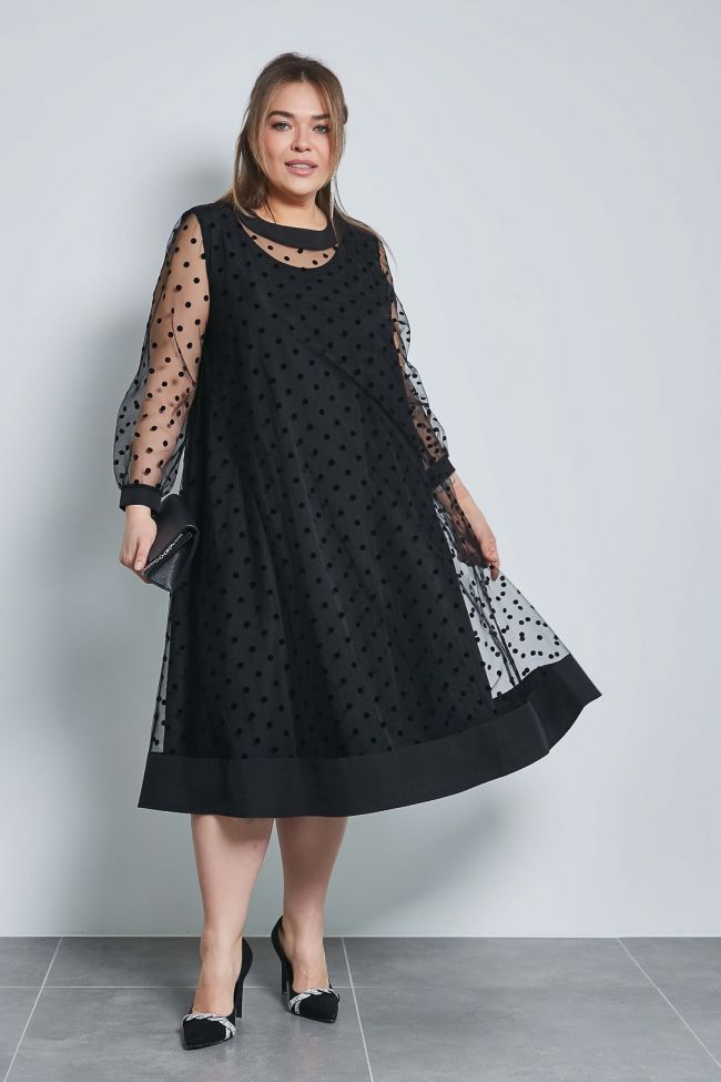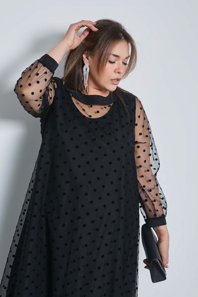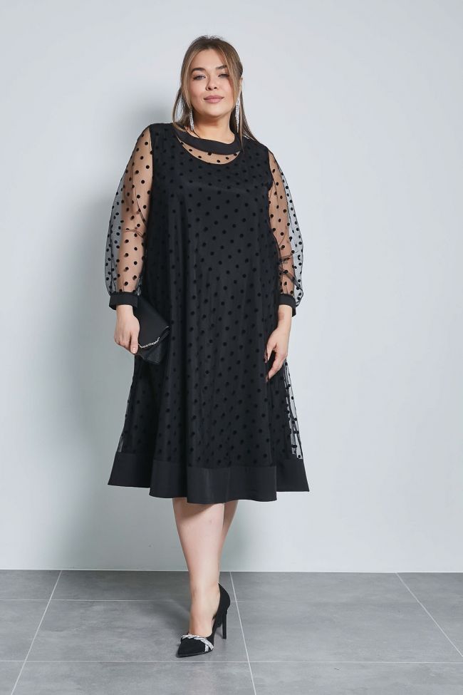 черный Оригинальное двойное платье А - образного силуэта. Верхний слой платья выполнен из мягкой сетки флок «горох». Круглый вырез горловины оформлен притачной обтачкой и дополнен по центру спинки застежкой на петлю и пуговицу. Рукава втачные длинные, по низу дополнены трикотажной манжетой. Широкая притачная вставка по низу и обтачка горловины в качестве отделки выполнены из ткани компаньона. Нижний слой платья выполнен из плательной ткани в тон верха. Горловина оформлена окантовкой. Слои скреплены между собой в области проймы.  Модель прекрасно подойдет обладательницам любых форм и поможет создать интересный вечерний образ.
