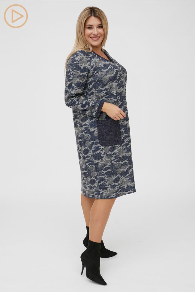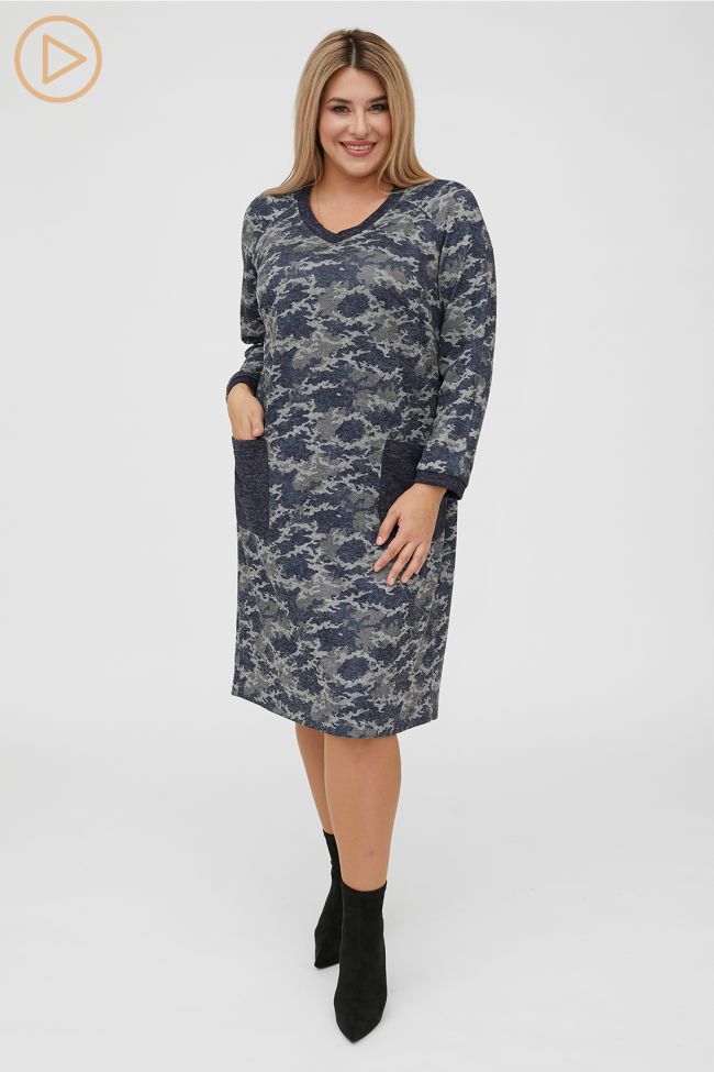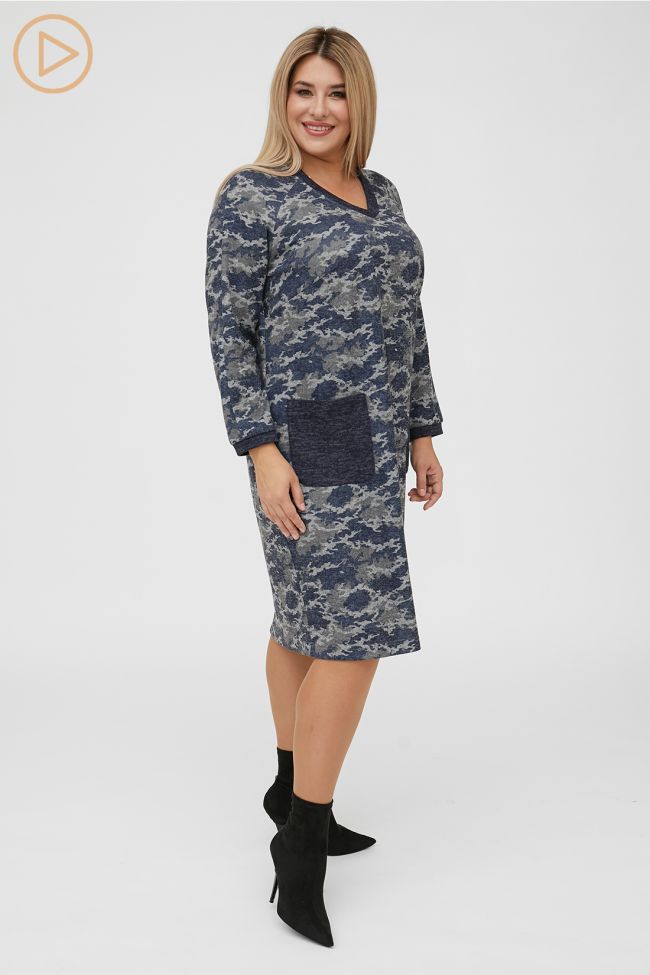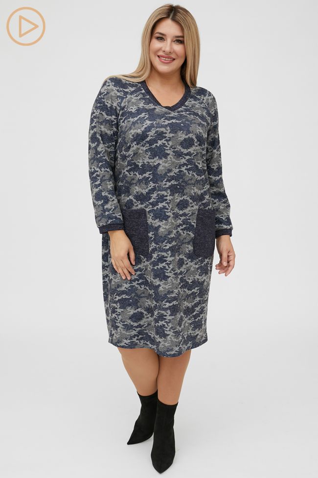темно-синий Комфортное платье прямого силуэта из принтованного трикотажа. V - образный вырез горловины, обработан бейкой. Прилегание по груди за счет вытачек. По переду  удобные накладные карманы округлой формы. Длинные рукава реглан , по низу дополнены манжетой. В виде отделки карманы, бейка горловины и манжета рукава выполнены из трикотажа меланж. Низ ровный, обработан на спецмашине. Отличный выбор для встречи с друзьями и повседневного выхода.