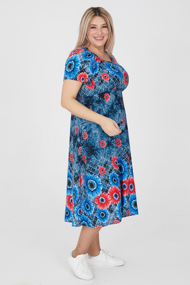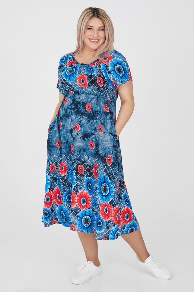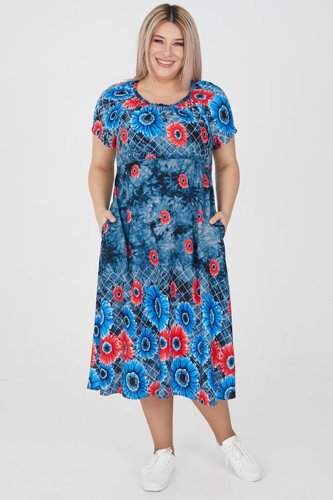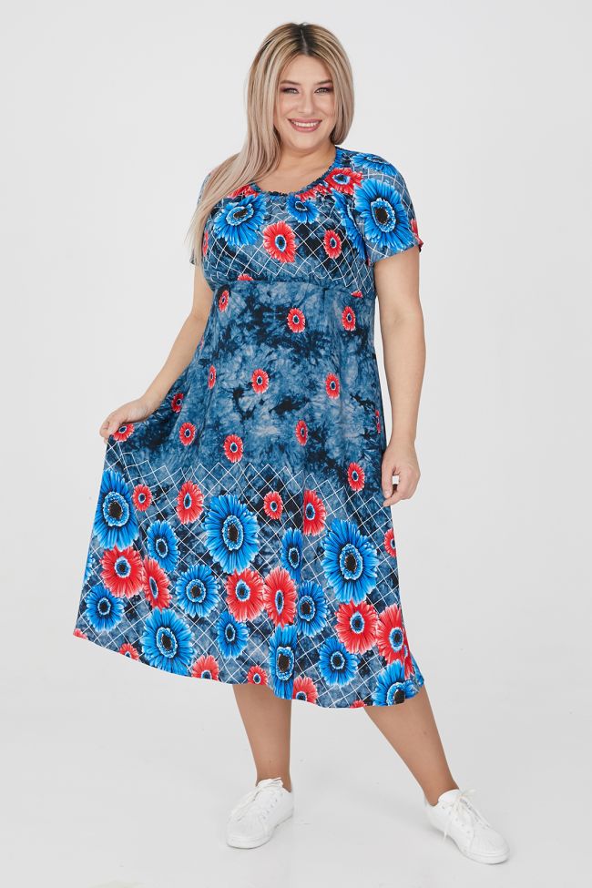 темно-синий Длинное платье полуприлегающего силуэта из яркой штапельной ткани с цветочным принтом. Широкое декольте оформлено эластичной резинкой с мелкой сборкой, что позволяет создать привлекательный образ. Рукава короткие, покроя «реглан». Завышенная линия талии отрезная, декорирована мелкой сборкой с помощью резинки по спинке. В боковых швах удобные карманы. Низ расклешенный. Отличный вариант для ярких, солнечных дней.