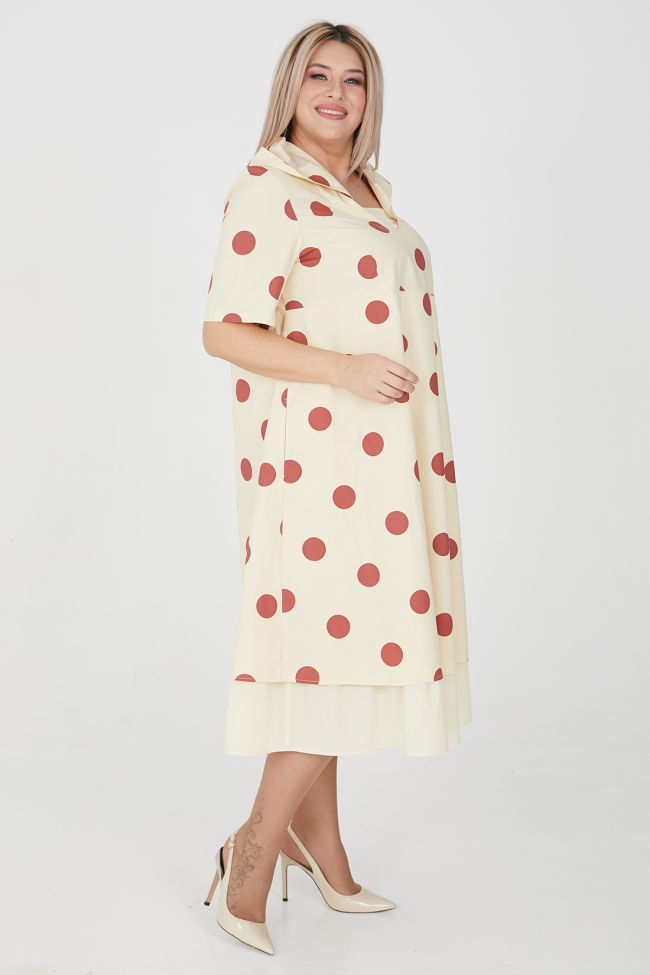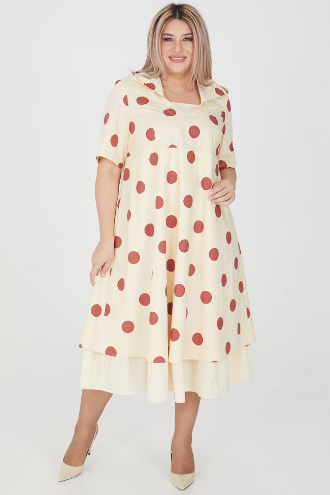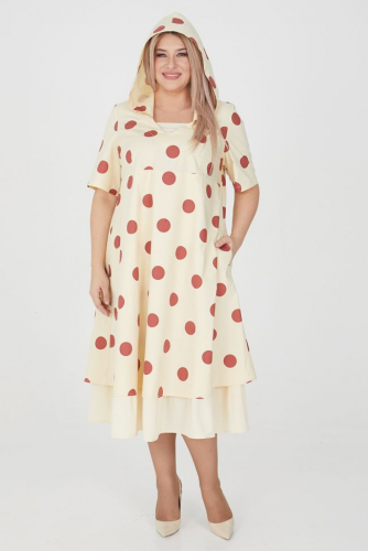коричневый Комбинированное платье трапециевидного силуэта из двух видов хлопковой ткани. Верх плотная хлопковая ткань в крупный горох, нижний слой и отделка из однотонной ткани. V-образный вырез горловины, дополнен вставкой из отделочной ткани и капюшоном. Рукав втачной,  укороченный. По переду и спинке отрезной лиф. Юбка двойная расклешенная, нижний слой чуть длиннее, выполнен из отделочной ткани и дополнен широкой рюшей. В боковых швах удобные карманы.