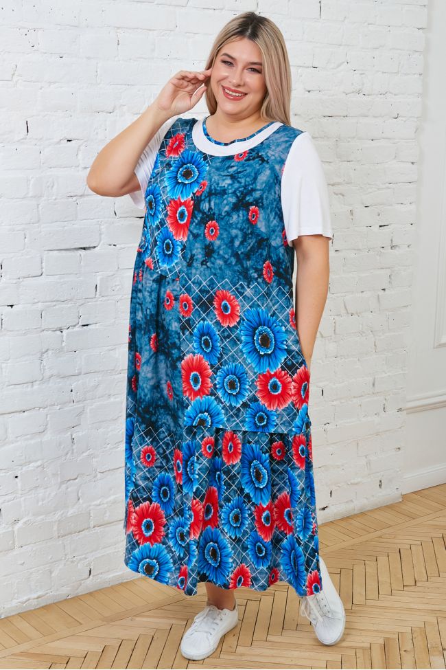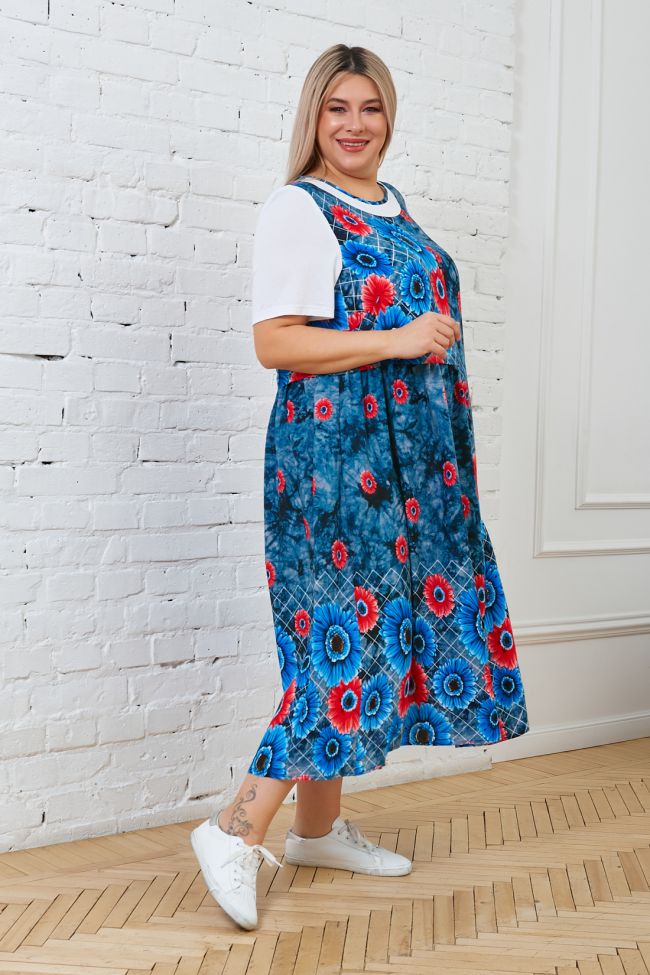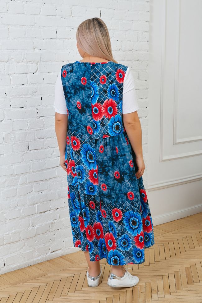 темно-синий Длинное женственное платье полуприлегающего силуэта из хлопковой ткани в яркий принт. Рукав, укороченный втачной, выполнен из трикотажа. По переду горловина оформлена трикотажной кокеткой в тон рукава. Круглый вырез горловины обработан окантовкой из основной ткани. Интересным решением модели представлены горизонтальные подрезы в области талии и бедер, дополненные мелкой сборкой, что придает изделию интересный внешний вид. Низ ровный. Модель подойдет обладательницам любых форм и украсит гардероб любой модницы.