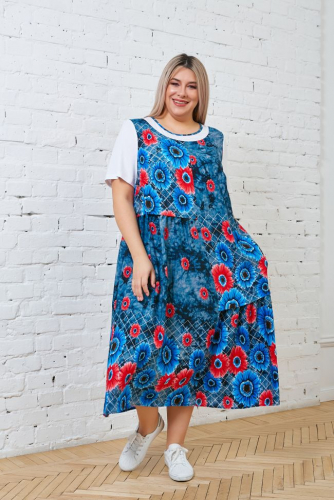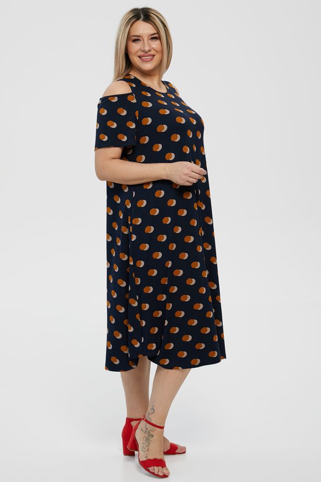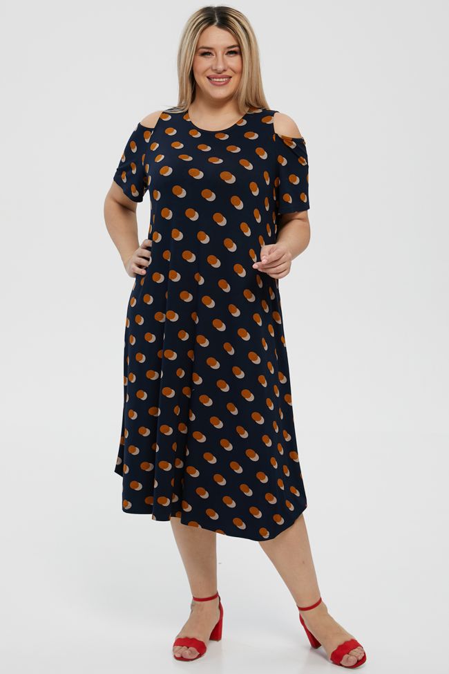 синий Оригинальное платье А - образного силуэта из вискозного трикотажа в принт. Круглый вырез горловины обработан внутренней окантовкой. В боковых швах удобные карманы. Рукава втачные, укороченной длины, верх рукава с открытой линией плеча, помогающей создать соблазнительный женственный образ. Низ изделия фигурный, с подхватом по боковым швам. Отличный выбор для повседневных образов.
