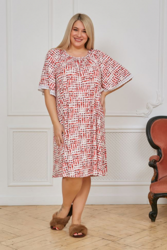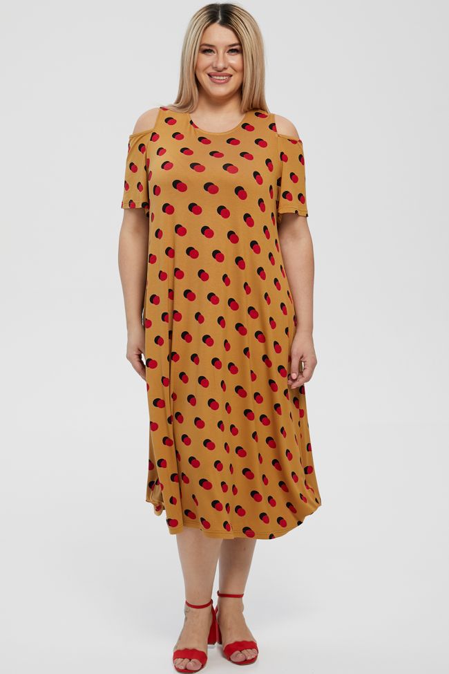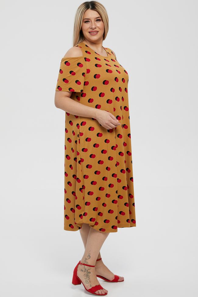 горчичный Оригинальное платье А - образного силуэта из вискозного трикотажа в принт. Круглый вырез горловины обработан внутренней окантовкой. В боковых швах удобные карманы. Рукава втачные, укороченной длины, верх рукава с открытой линией плеча, помогающей создать соблазнительный женственный образ. Низ изделия фигурный, с подхватом по боковым швам. Отличный выбор для повседневных образов.