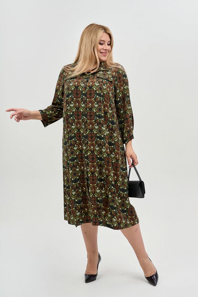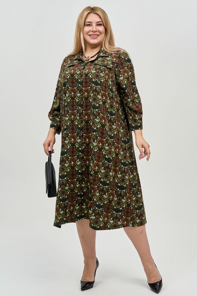 зеленый Платье прямого силуэта из плательной ткани в принт. Прилегание по груди за счет вытачек. По линии груди декоративные элементы в виде клапанов с пуговицей. Горловина оформлена отложным воротником на притачной стойке. По переду планка по всей длине изделия, с застежкой на петли и пуговицы. Втачной рукав длиной 7/8 по низу оформлен двумя складками. В боковых швах удобные карманы. Низ прямой. Стильный, удобный вариант для летних прогулок.