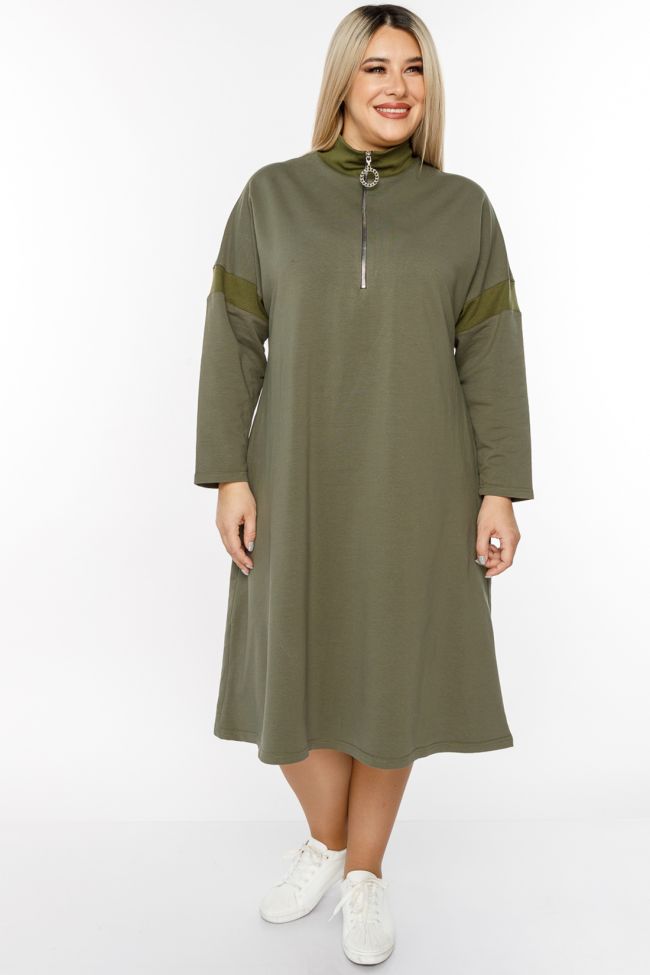 хаки Комфортное платье А - силуэта, длиной за линию колен. Модель выполнена из плотного трикотажа. Прилегание по груди за счет вытачек. Длинный рукав на спущенной линии плеча. Круглый вырез горловины оформлен воротником-стойка, по центру переда застежка-молния до линии груди. В боковых швах удобные карманы. Низ ровный. Модель станет отличным дополнением повседневного гардероба в прохладное время года.