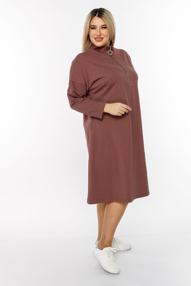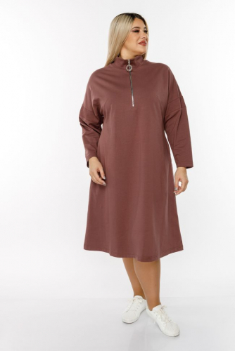 капучино Комфортное платье А - силуэта, длиной за линию колен. Модель выполнена из плотного трикотажа. Прилегание по груди за счет вытачек. Длинный рукав на спущенной линии плеча. Круглый вырез горловины оформлен воротником-стойка, по центру переда застежка-молния до линии груди. В боковых швах удобные карманы. Низ ровный. Модель станет отличным дополнением повседневного гардероба в прохладное время года.