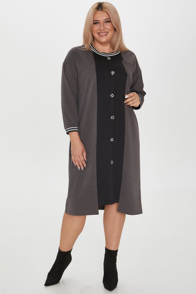 серый Элегантное платье полуприлегающего силуэта из комбинированного трикотажа. Перед с центральной укороченной вставкой из отделочной ткани, с имитацией застежки на петли и пуговицы по всей длине, слева на груди накладной карман. Рукава 7/8 на спущенной линии плеча. Вырез горловины – круглый. Низ рукавов и горловина оформлены яркими подвязами. В боковых швах удобные карманы. Отличный выбор для деловых встреч и повседневного выхода.