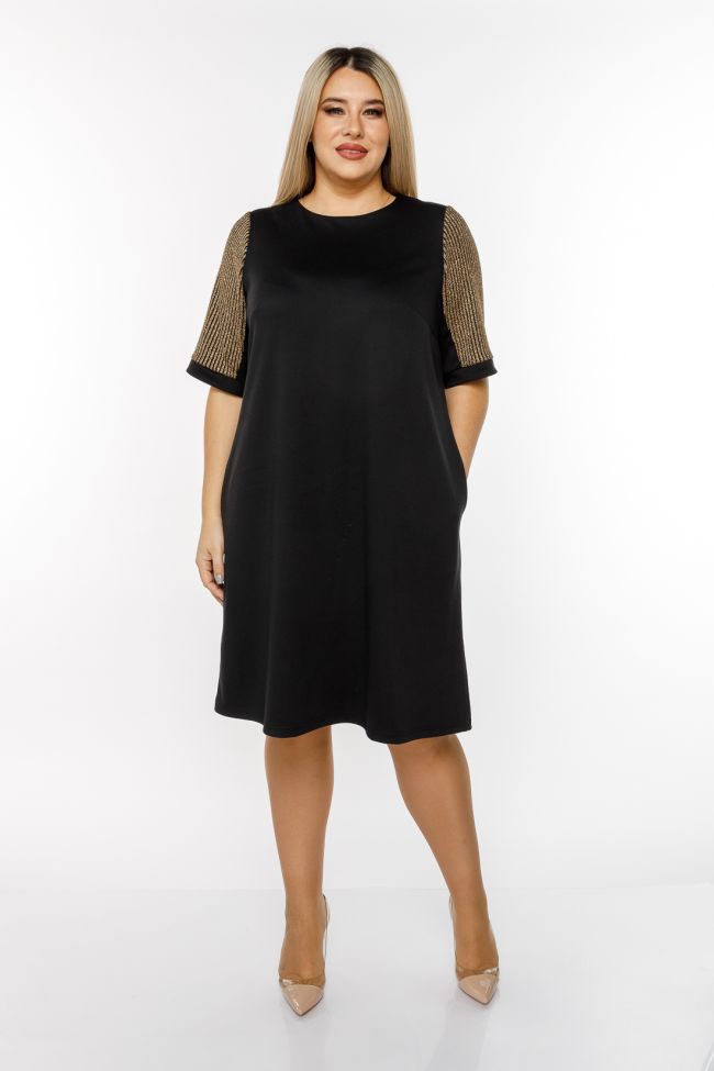 черный Нарядное платье А - образного силуэта длиной до линии колен. Модель выполнена из трикотажного полотна «джерси». Круглый вырез горловины обработан внутренней обтачкой. Прилегание по груди за счет вытачек. По спинке средний шов оканчивающийся застежкой - молнией сверху. Втачные рукава из отделочной ткани с пайетками, длиной до линии локтя. По низу дополнены узкой манжетой. Низ ровный.