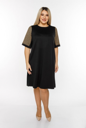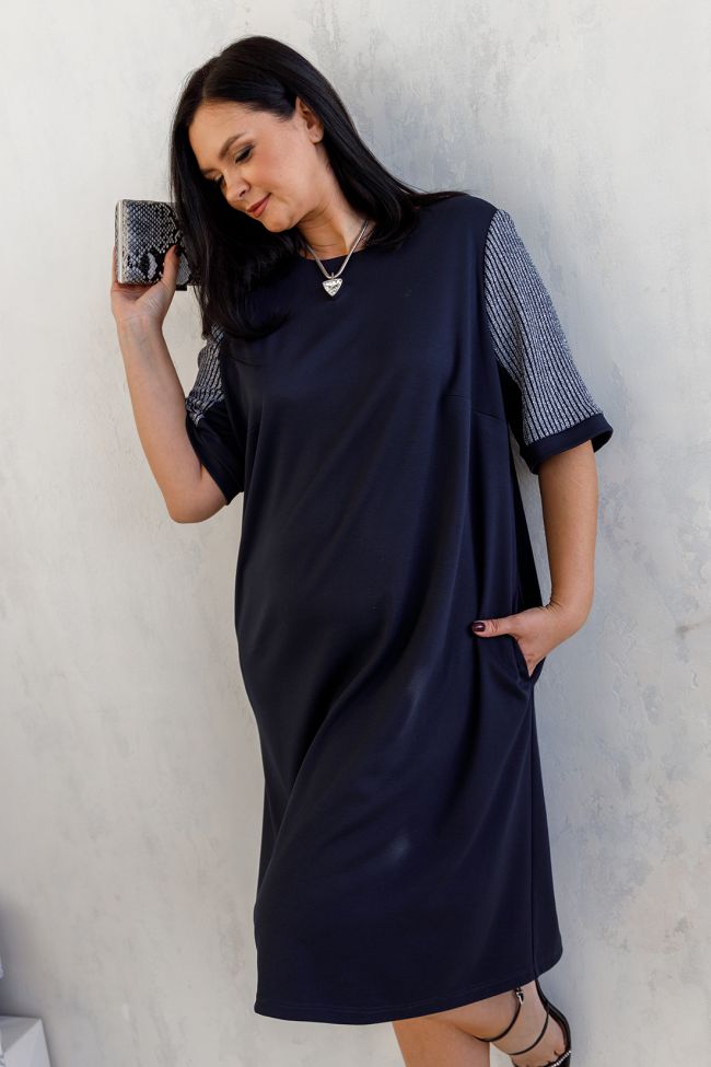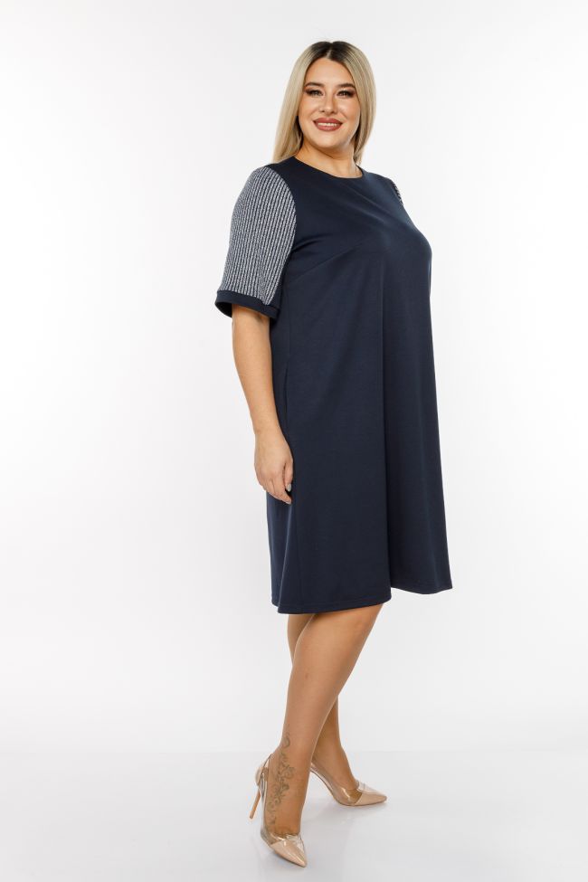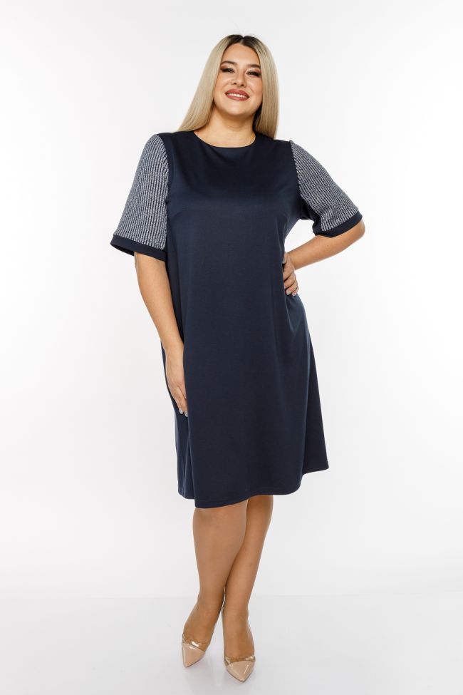 темно-синий Нарядное платье А - образного силуэта длиной до линии колен.Модель выполнена из трикотажного полотна «джерси». Круглый вырез горловины обработан внутренней обтачкой. Прилегание по груди за счет вытачек. По спинке средний шов оканчивающийся застежкой - молнией сверху. Втачные рукава из отделочной ткани с пайетками, длиной до линии локтя. По низу дополнены узкой манжетой. Низ ровный.