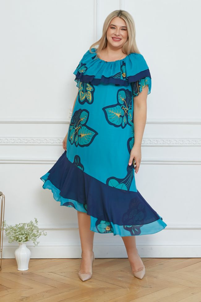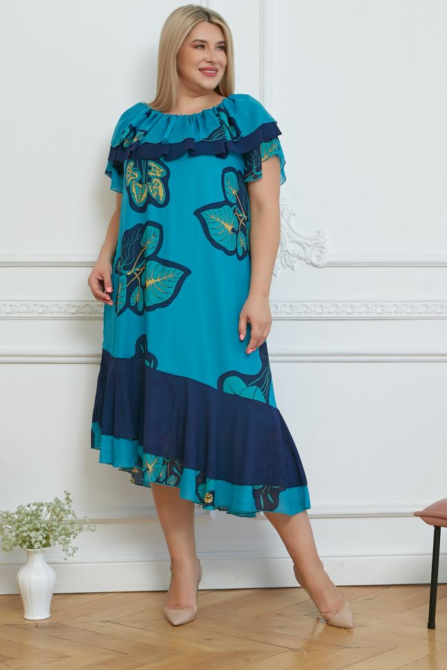 бирюзовый Женственное платье прямого силуэта длиной до линии икр. Модель выполнена из шифона с ярким принтом, на подкладке. Широкий, круглый вырез горловины присобран на резинку и дополнен двойной рюшей. Рукав реглан укороченной длины. Низ изделия, асимметричный с диагональным подрезом, оформлен также как горловина, широкой двойной рюшей. Легкое платье поможет создать интересный нежный образ.