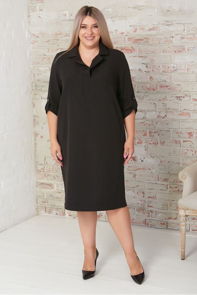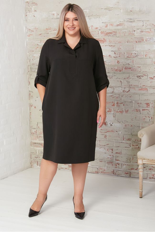черный Платье свободного силуэта из плательной ткани "Барби". V-образный вырез горловины дополнен отложным воротником, переходящим в планку. По переду отрезная горизонтальная кокетка и вертикальные рельефы с сужением к низу. По спинке отрезная кокетка, дополнена мелкими складками и центральным швом, имитирующим застежку, с пуговицами по всей длине. В боковых швах удобные карманы. Втачные рукава, длиной 3/4 дополнены патой на пуговице. Низ ровный.