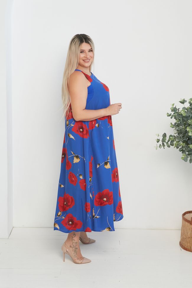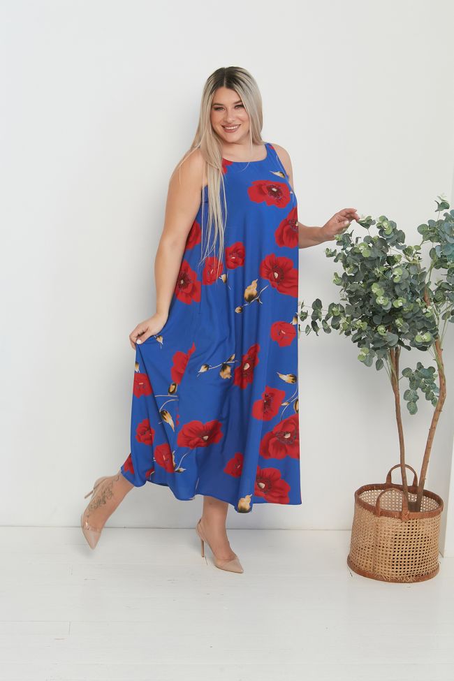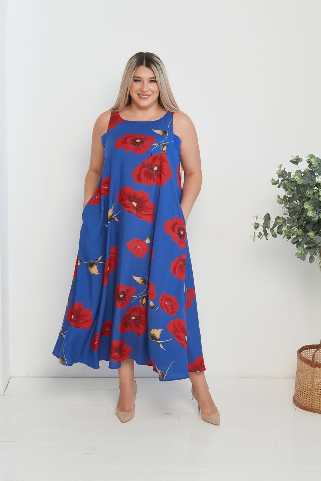 синий Яркое удлиненное платье А - образного силуэта на широких бретелях, длиной чуть выше щиколотки. Модель выполнена из хлопковой ткани с принтом «цветы». В области проймы оригинальные однотонные вставки из трикотажной ткани. В боковых швах удобные карманы, низ ровный. Комфортная модель для летнего образа отлично скрывающая все недостатки фигуры.