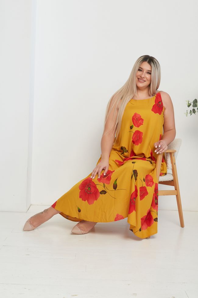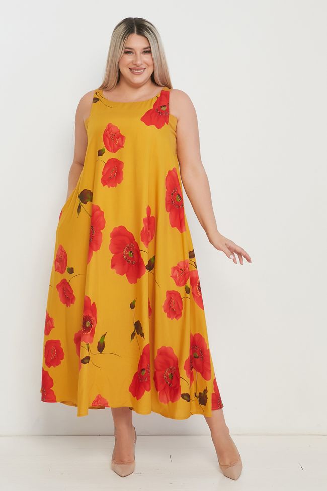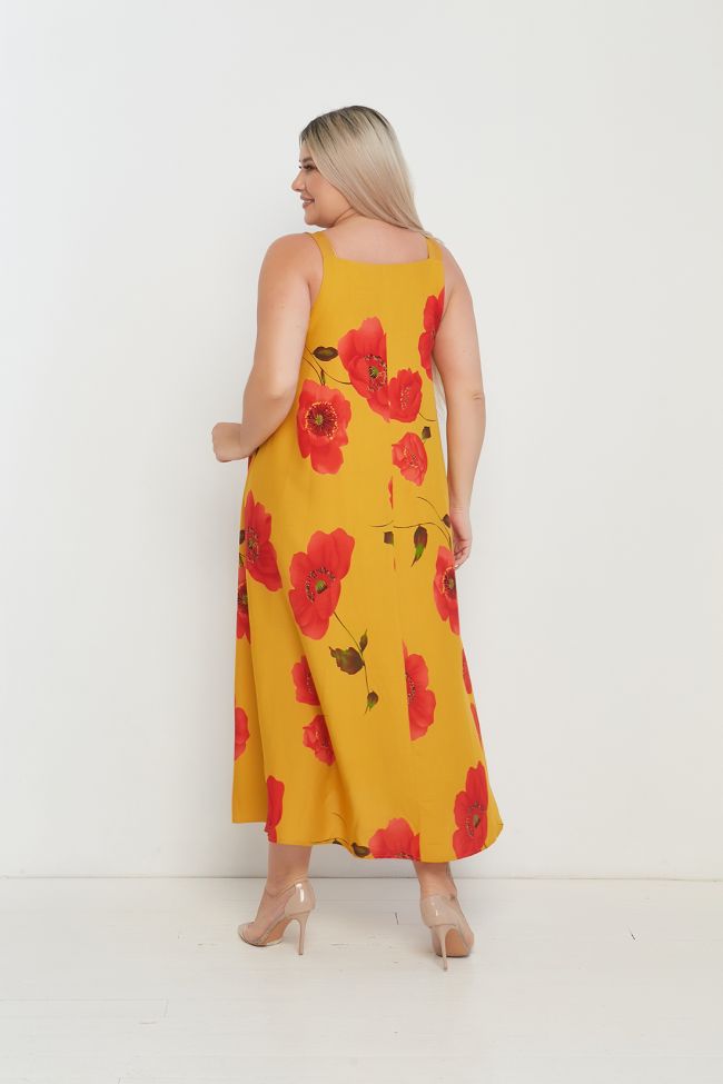 оранжевый Яркое удлиненное платье А - образного силуэта на широких бретелях, длиной чуть выше щиколотки. Модель выполнена из хлопковой ткани с принтом «цветы». В области проймы оригинальные однотонные вставки из трикотажной ткани. В боковых швах удобные карманы, низ ровный. Комфортная модель для летнего образа отлично скрывающая все недостатки фигуры.