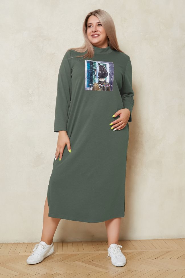 зеленый Комфортное платье, прямого силуэта, длиной за колено. Модель выполнена из меланжевого трикотажного полотна. Круглый вырез горловины оформлен воротником - стойкой. По переду оригинальная крупная аппликация. Рукава длинные втачные. В боковых швах удобные карманы. Низ ровный, по бокам разрезы. Платье прекрасно дополнит повседневный гардероб в прохладное время года.