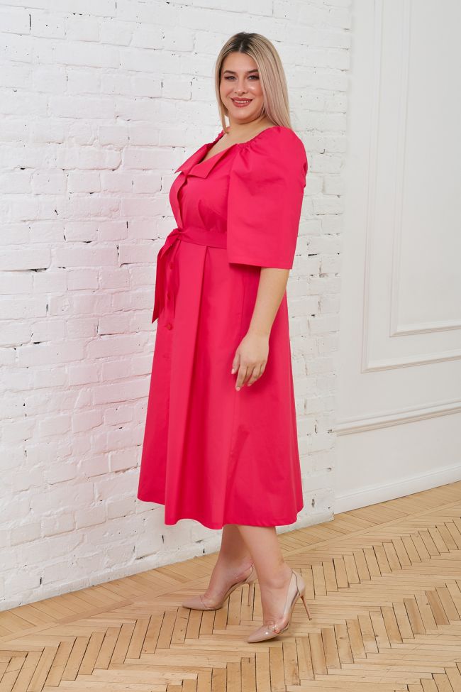 фуксия Изящное платье прилегающего силуэта из хлопковой ткани, длиной за линию колен. Комфортное прилегание по фигуре - за счет вытачек переда и спинки. Линия талии отрезная. По переду центральная застежка на петли и пуговицы на всю длину изделия. Вырез горловины фигурный, дополнен отложными уголками. В боковых швах удобные карманы. Рукава полуреглан длиной до линии локтя, по окату оригинально присобраны на резину. Низ ровный. Модель дополнена поясом из основной ткани.