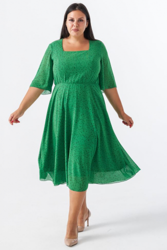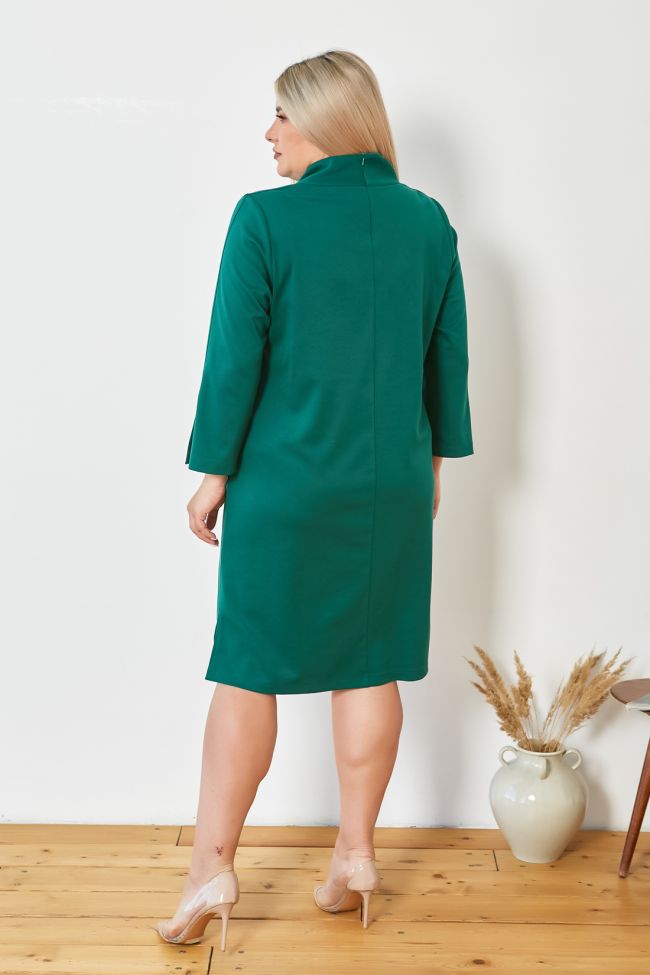зеленый Комфортное платье полуприлегающего силуэта из трикотажного полотна "джерси", длиной до линии колен. Круглый вырез горловины обработан воротником полустойкой. Спинка со средним швом, сверху оканчивающимся застежкой молнией. Перед с удобными накладными карманами по линии бедер. Прилегание по груди за счет вытачек. Рукав втачной, длиной 7/8, по центру рукава шов, оканчивающийся шлицей. Низ изделия фигурный, перед с закруглением по бокам, спинка прямая. По бокам разрезы. Модель станет отличным дополнением вашего стильного гардероба