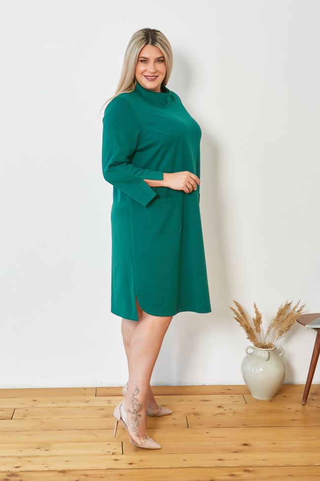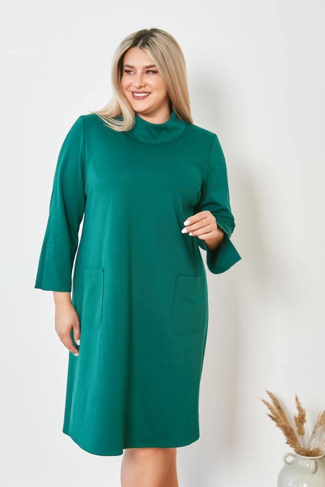 зеленый Комфортное платье полуприлегающего силуэта из трикотажного полотна "джерси", длиной до линии колен. Круглый вырез горловины обработан воротником полустойкой. Спинка со средним швом, сверху оканчивающимся застежкой молнией. Перед с удобными накладными карманами по линии бедер. Прилегание по груди за счет вытачек. Рукав втачной, длиной 7/8, по центру рукава шов, оканчивающийся шлицей. Низ изделия фигурный, перед с закруглением по бокам, спинка прямая. По бокам разрезы. Модель станет отличным дополнением вашего стильного гардероба