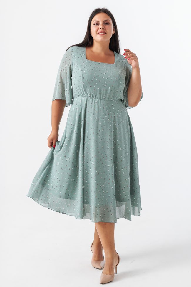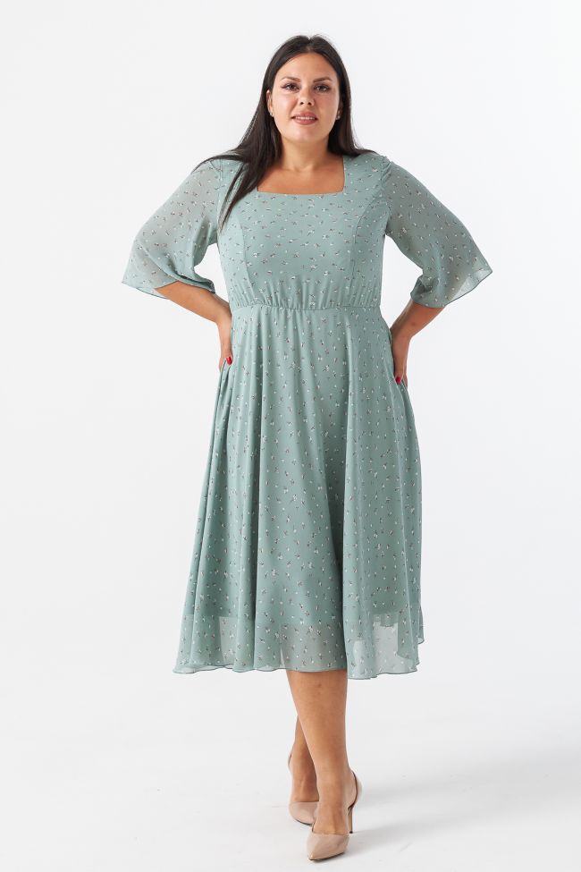 светло-зеленый Женственное платье приталенного силуэта из легкого шифона в мелкий принт. Модель на трикотажной подкладке. Вырез горловины - фигурное "карэ», открывает зону декольте подчеркивая линию шеи и плеч. Втачные  укороченные рукава с расклешением книзу. Прилегающий лиф подчеркнут вертикальными рельефами, талия на резинке. Низ платья расклешенный, с мягкими складками. Низ изделия и рукавов обработан аккуратным ролевым швом. Женственный силуэт и элегантная длина придают модели романтичности.  Замечательный выбор для выхода и встречи с друзьями.