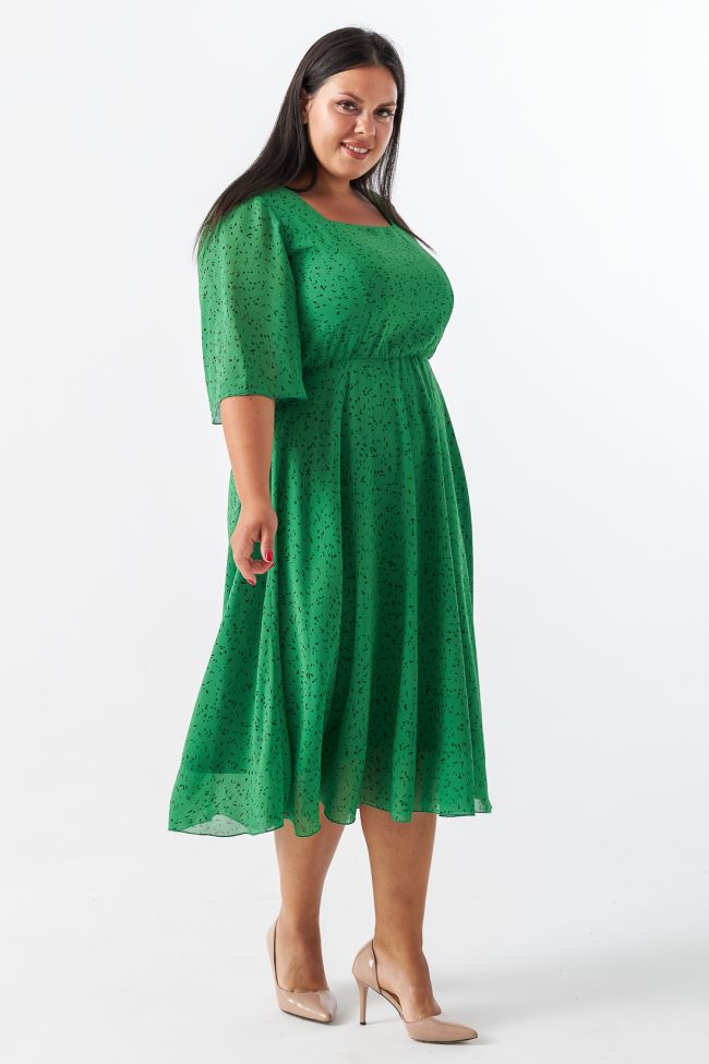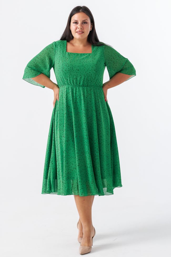 зеленый Женственное платье приталенного силуэта из легкого шифона в мелкий принт. Модель на трикотажной подкладке. Вырез горловины - фигурное "карэ», открывает зону декольте подчеркивая линию шеи и плеч. Втачные  укороченные рукава с расклешением книзу. Прилегающий лиф подчеркнут вертикальными рельефами, талия на резинке. Низ платья расклешенный, с мягкими складками. Низ изделия и рукавов обработан аккуратным ролевым швом. Женственный силуэт и элегантная длина придают модели романтичности.  Замечательный выбор для выхода и встречи с друзьями.