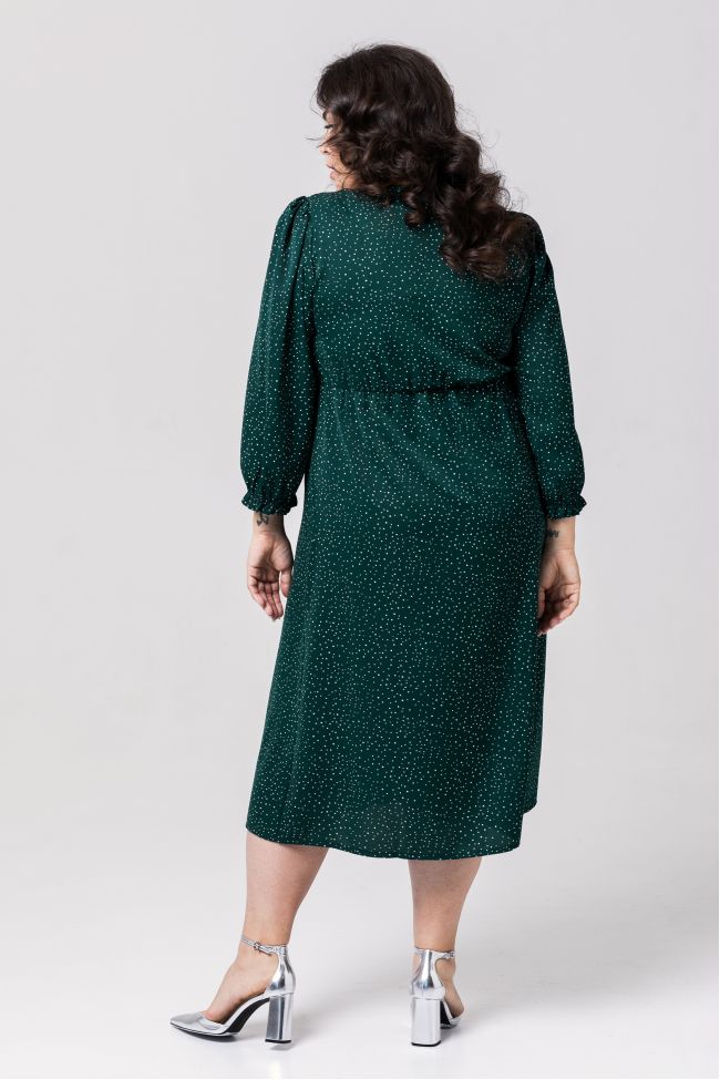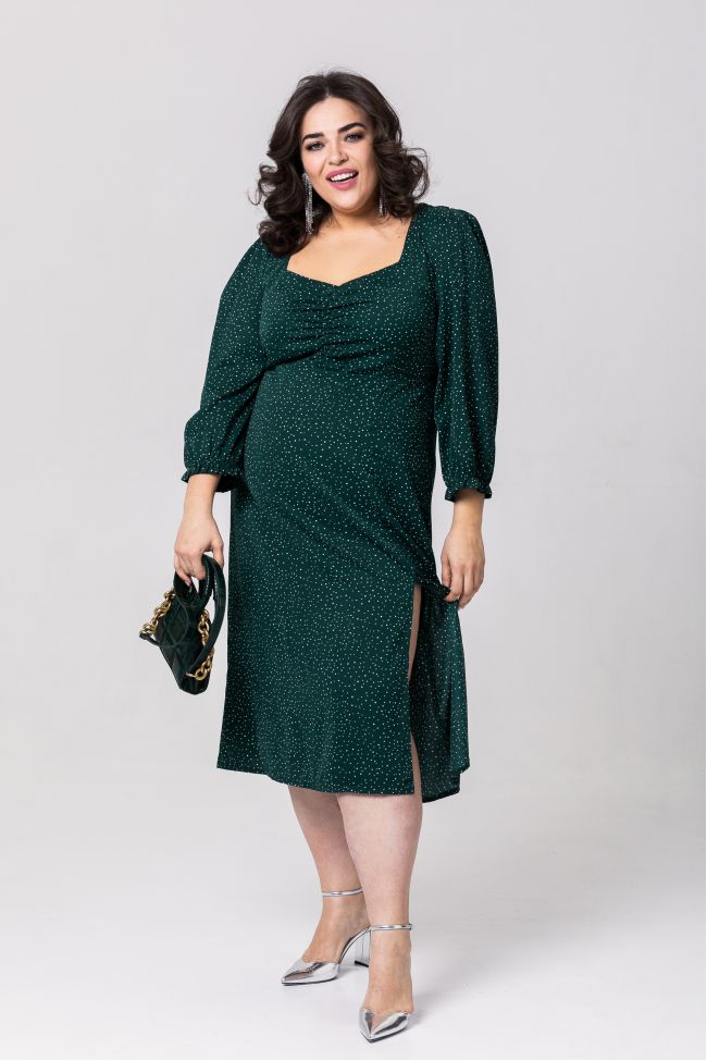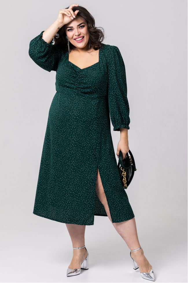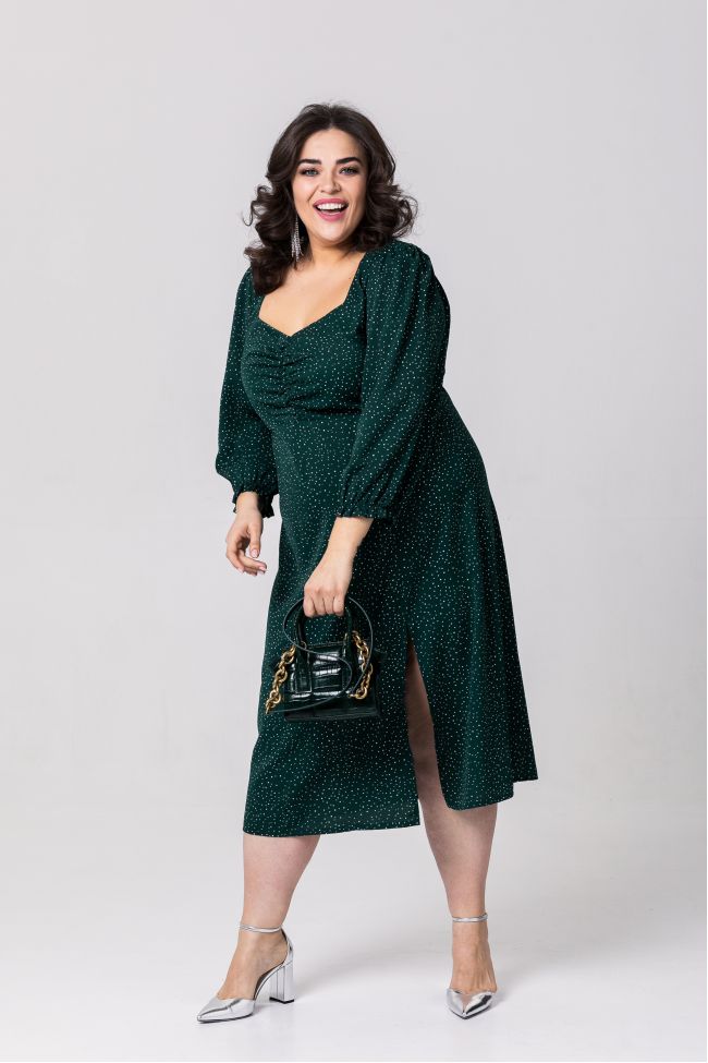 зеленый Женственное платье полуприлегающего силуэта длиной за линию колен, выполнено из легкой плательной ткани в мелкий горох. Фигурный вырез "каре", дополнен стяжкой по центру. Длинные втачные рукава со сборкой по окату, по низу присобраны на резинку. Лиф отрезной, нижняя часть платья прямая дополнена разрезом слева. Низ ровный.