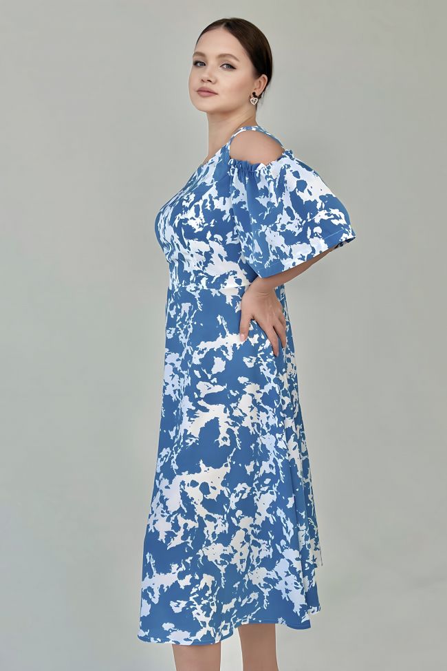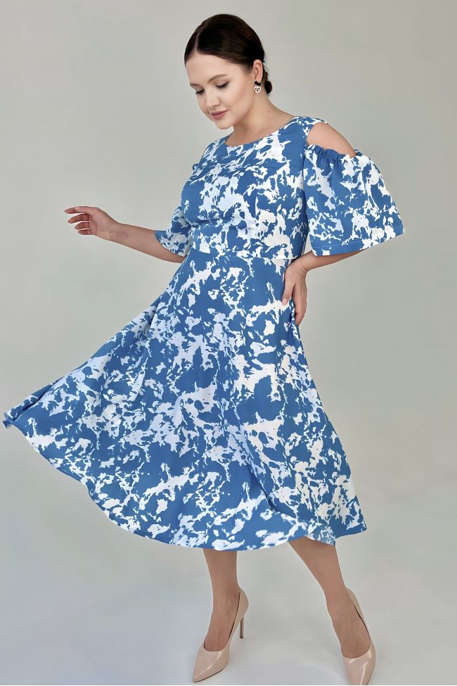 голубой Женственное платье полуприлегающего силуэта, длиной за линию колен. Модель выполнена из плательной принтованной ткани. Лиф отрезной, обтачной подкладкой. Прилегание по груди за счет рельефов. Талия по спинке присобрана на резинку. Вырез горловины круглый. Рукава укороченной длины, верх рукава с открытой линией плеча. Низ изделия расклешенный. Модель прекрасно дополнит летний повседневный образ.