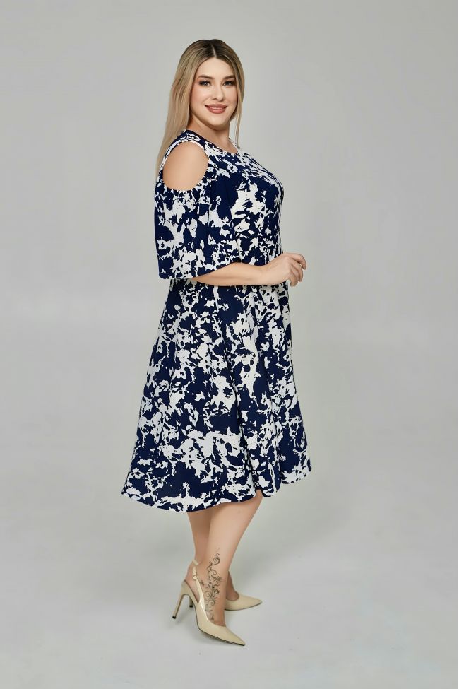 темно-синий Женственное платье полуприлегающего силуэта, длиной за линию колен. Модель выполнена из плательной принтованной ткани. Лиф отрезной, обтачной подкладкой. Прилегание по груди за счет рельефов. Талия по спинке присобрана на резинку. Вырез горловины круглый. Рукава укороченной длины, верх рукава с открытой линией плеча. Низ изделия расклешенный. Модель прекрасно дополнит летний повседневный образ.