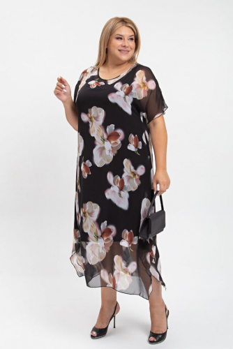 черный Модель платья «двойка» из эластичного трикотажного полотна - масла. Приталенность силуэта подчеркнута баской верхней части. Вставка из сетки подчеркивает зону декольте. Втачные рукава 3/4 открывают красивые запястья. Модель с вертикальными рельефами по спинке и переду, переходящими в баску. Низ ровный, по среднему шву разрез. Замечательное стильное решение для выходного дня.