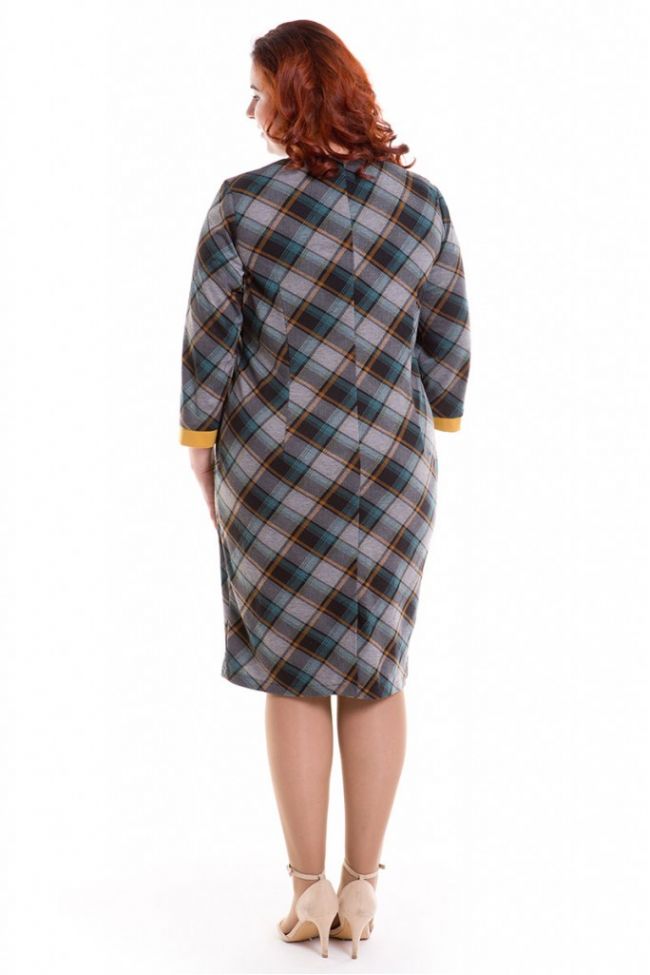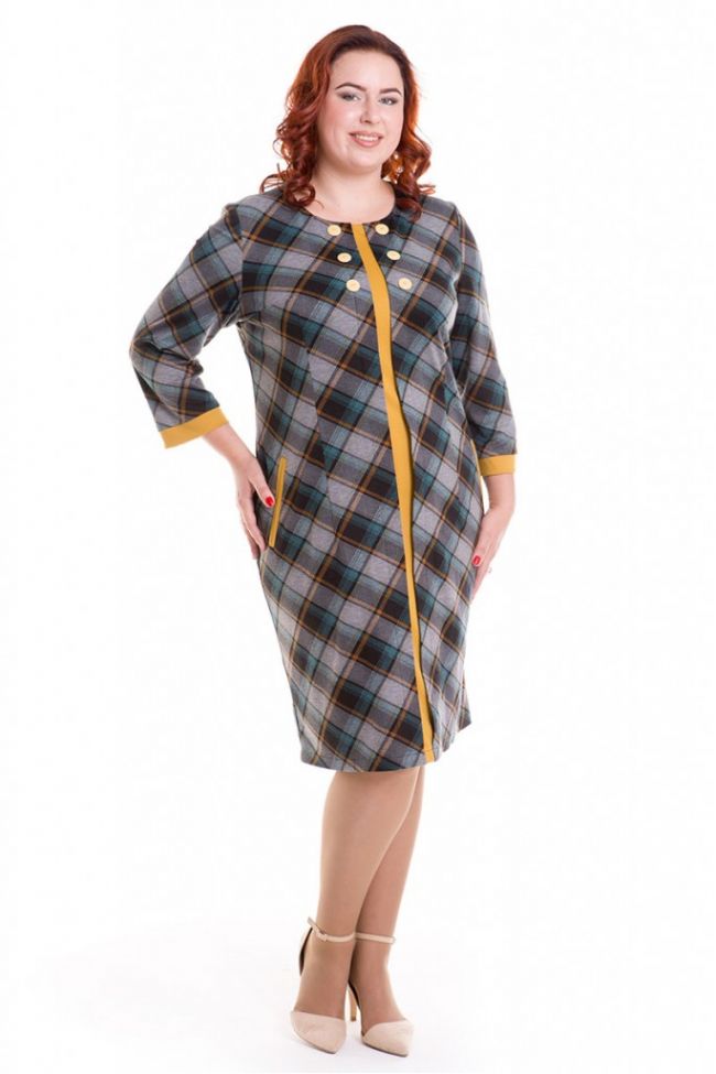 клетка Эффектное платье полуприлегающего силуэта из трикотажного полотна двух расцветок. Модель с круглым вырезом горловины на внутренней обтачке.  Втачные рукава длиной 7/8 по нижнему срезу дополнены манжетой. Спереди по центру вертикальная контрастная вставка дополненная пуговицами, которая визуально корректирует Ваш силуэт, делая его стройнее. Вытачки обеспечат идеальную посадку по фигуре. На уровне бедер имитация прорезных карманов из отделочного материала. Спинка с потайной застежкой на молнию для удобства надевания. Платье подчеркнет достоинства Вашей фигуры и скроет небольшие несовершенства. Замечательный выбор для встречи с подругой в кафе и для работы.
