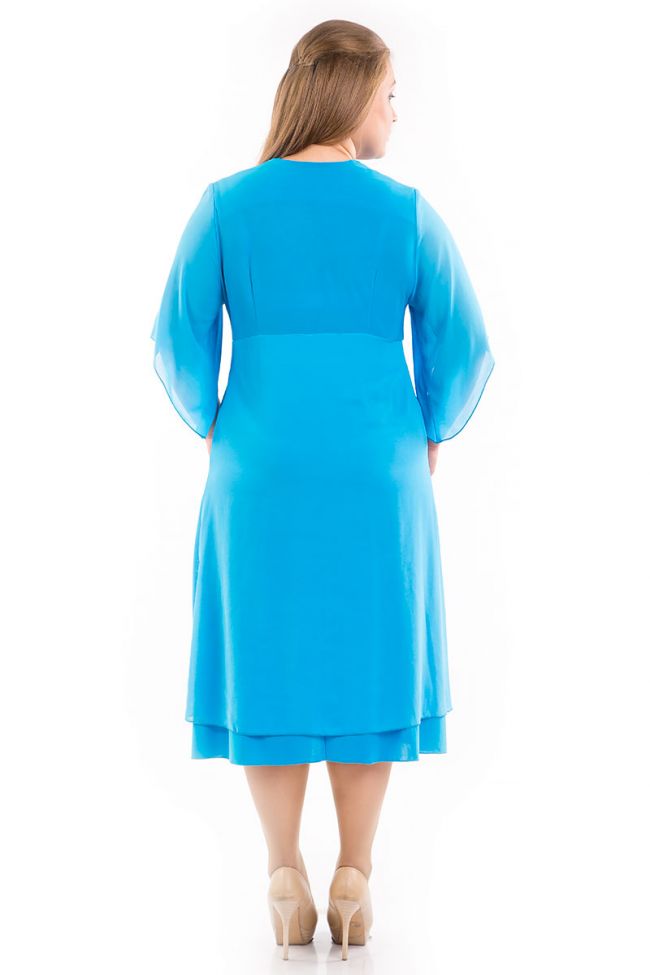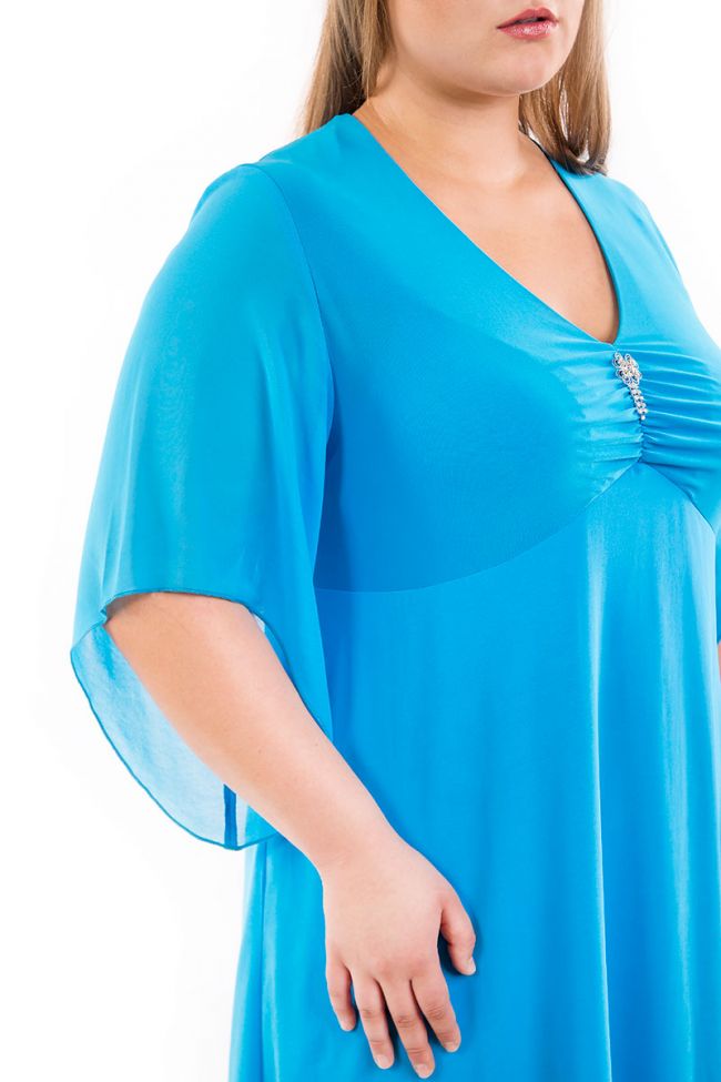 голубой Нарядное комбинированное платье из легкого шифона и пластичного трикотажного полотна. V-образный вырез горловины переходит в сборку по груди. Втачные рукава из нежного шифона с асимметричным низом прикрывают линию локтя. Платье с завышенной линией талии. Шифоновая юбка платья на трикотажном подкладе, расклешенная книзу, дарит ощущение свободы и легкости. (без броши)